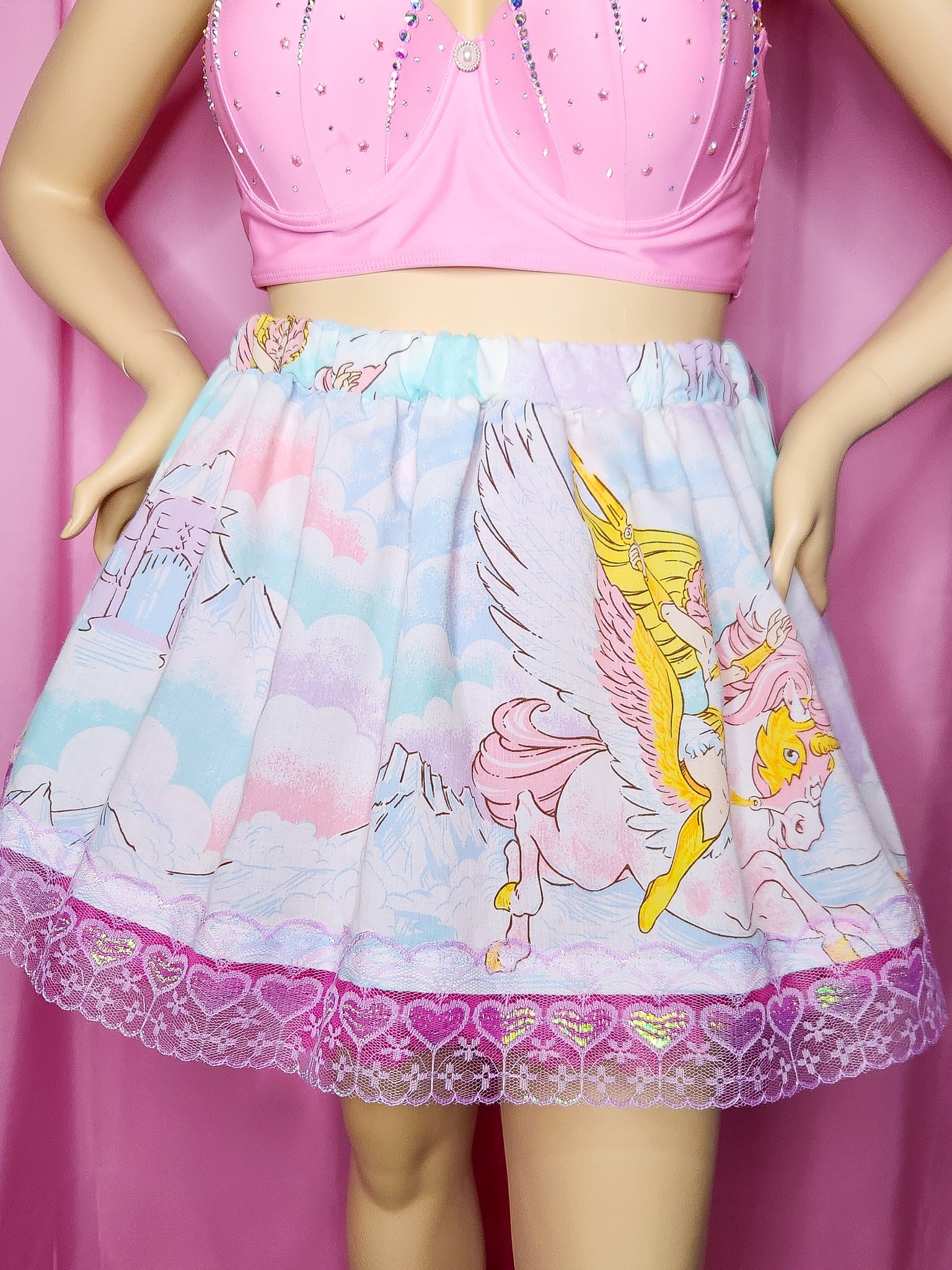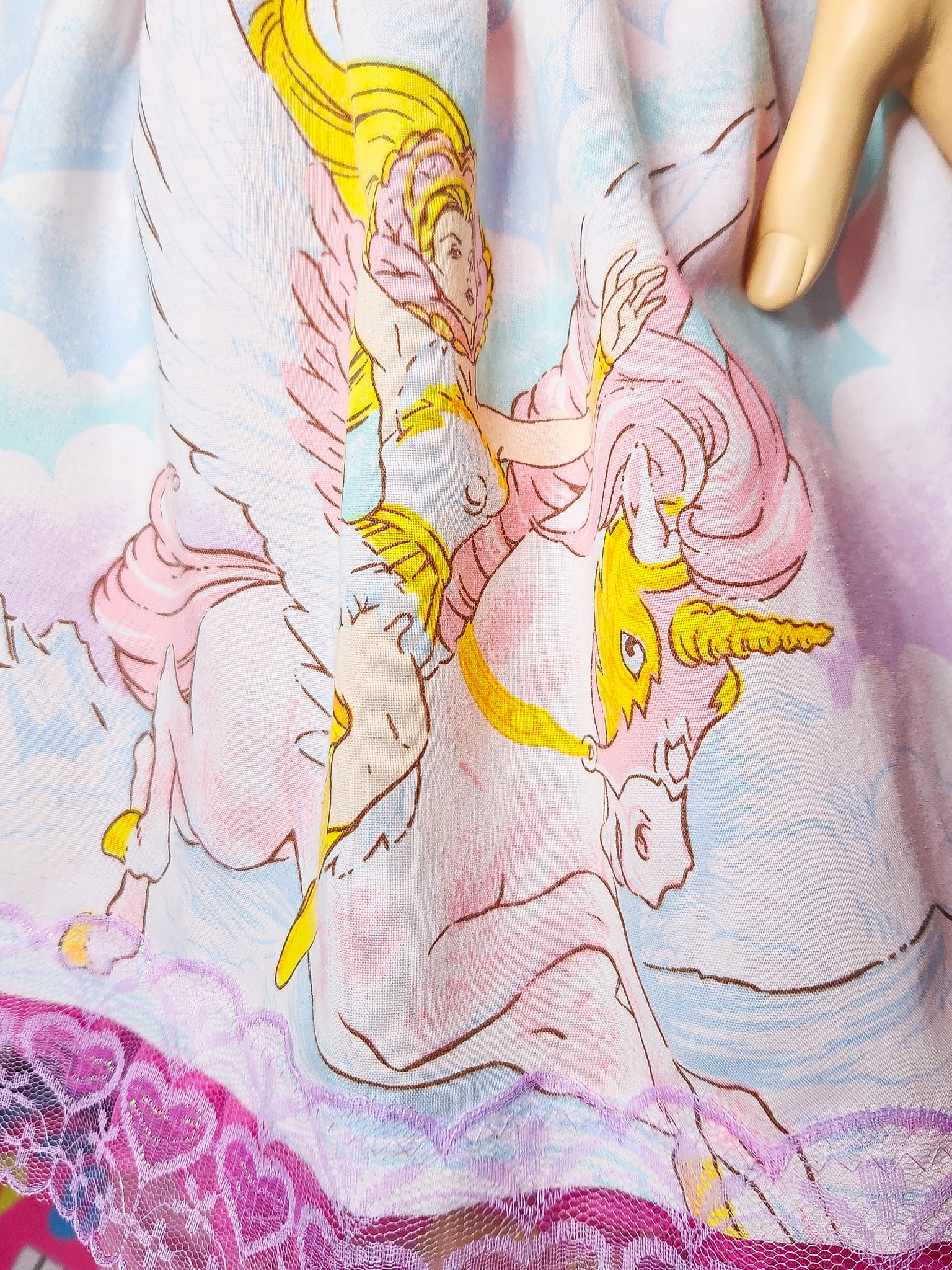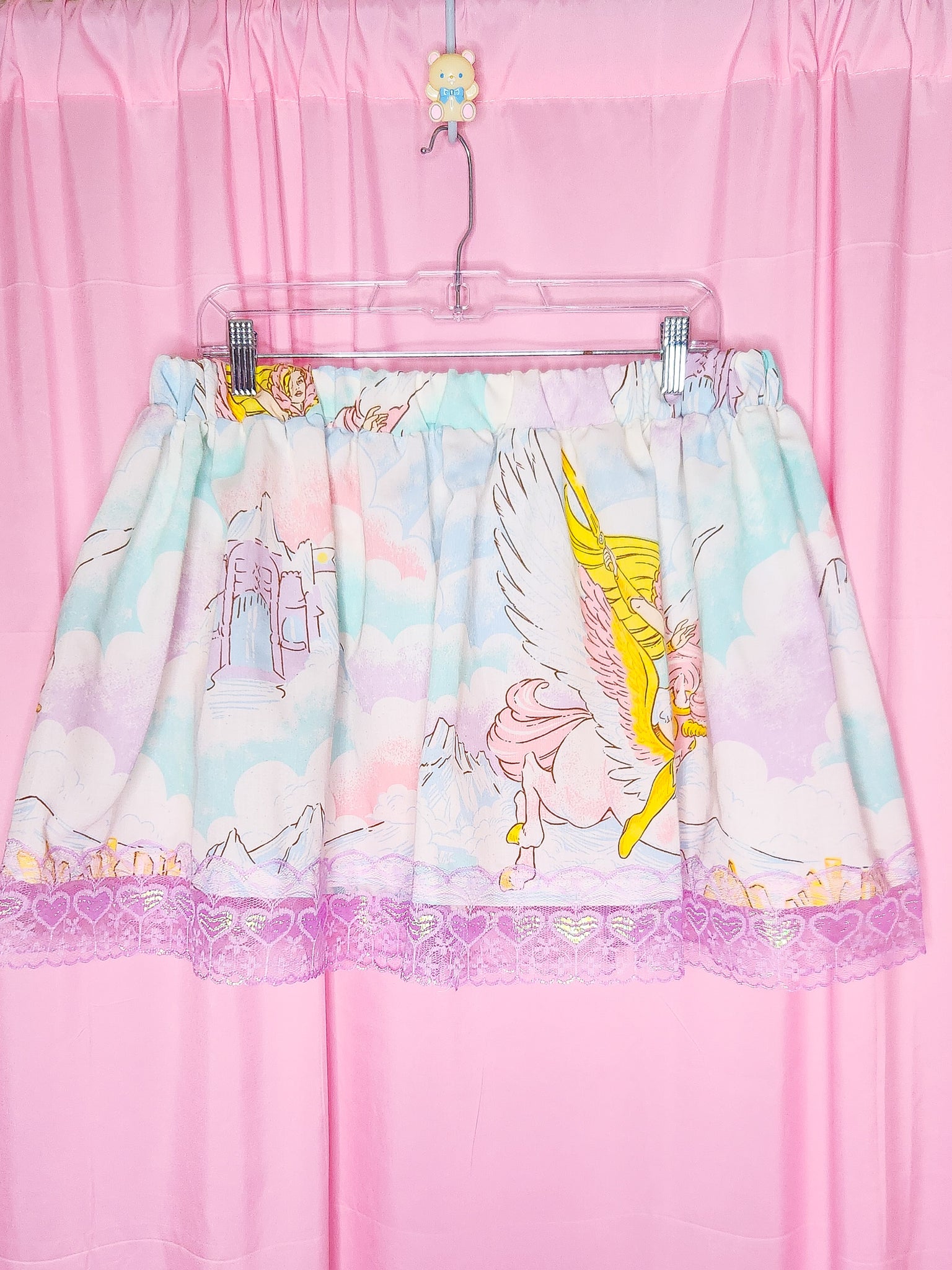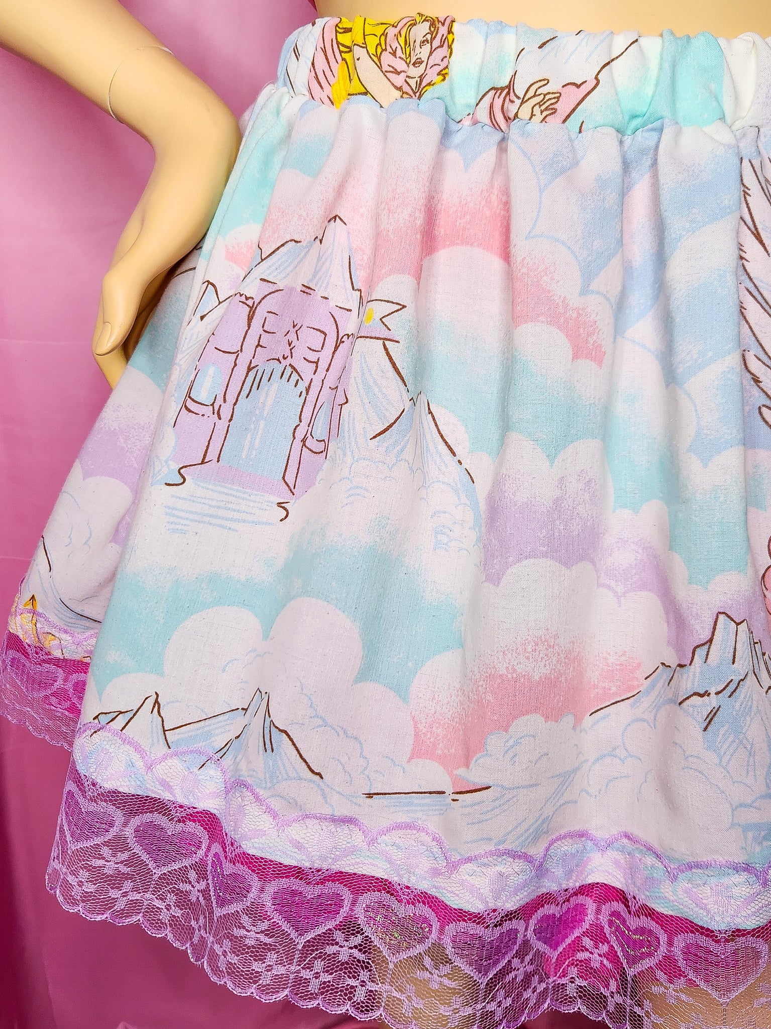 π MATERIALS: Upcycled bedsheets featuring She-Ra makes up this full skirt! Pinkish lavender iridescent flat heart lace along the bottom. Elastic waisted.