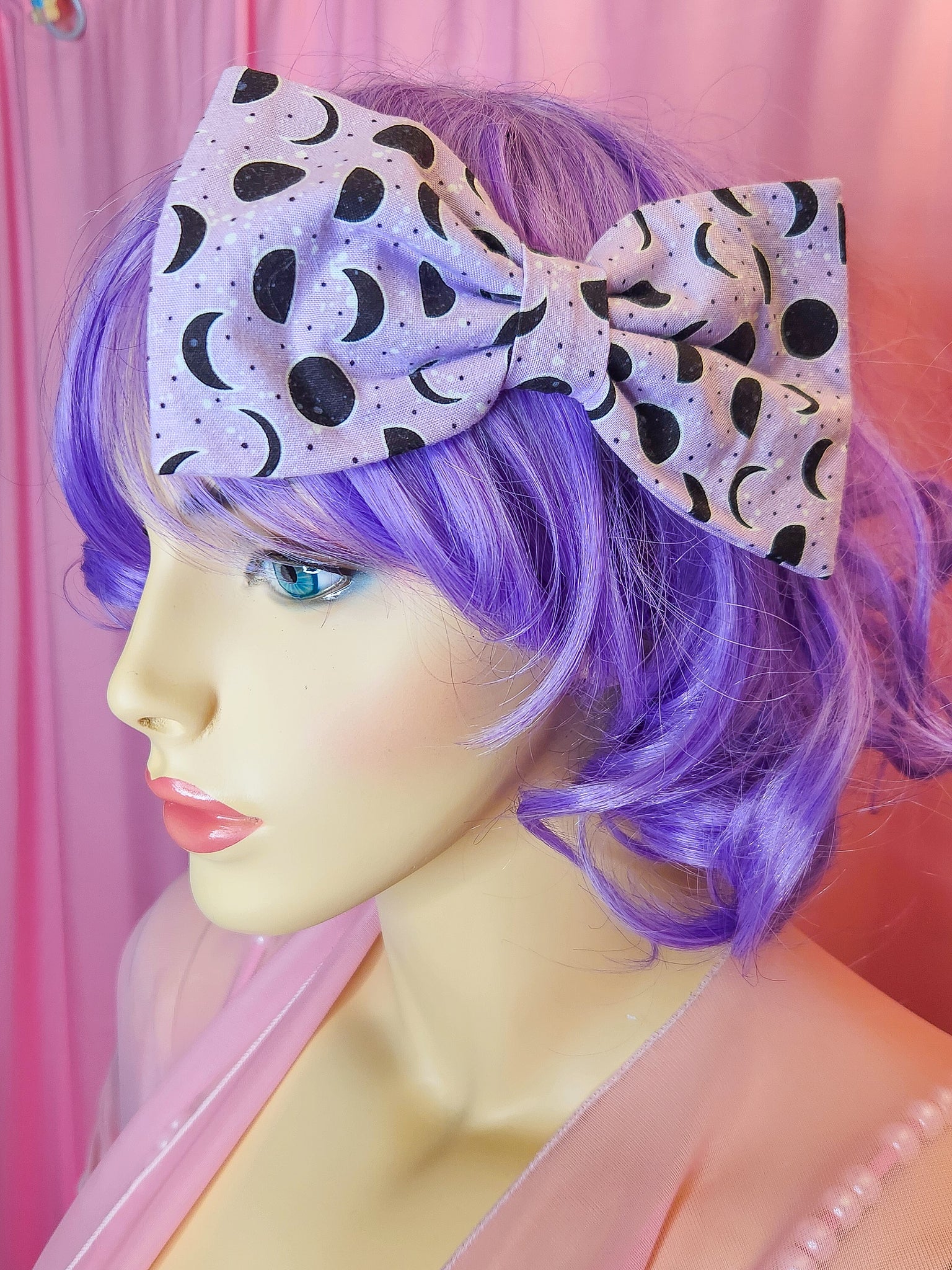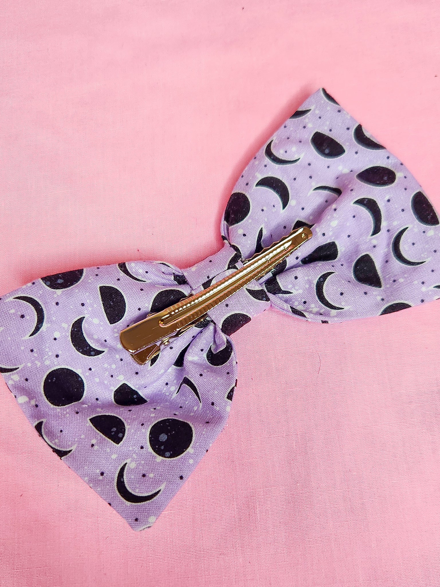 π MATERIALS: Lavender cotton fabric with a black moon phase print makes up this hairbow! Fastens with alligator clip. Wear in your hair, on your bags, or as a bow tie!