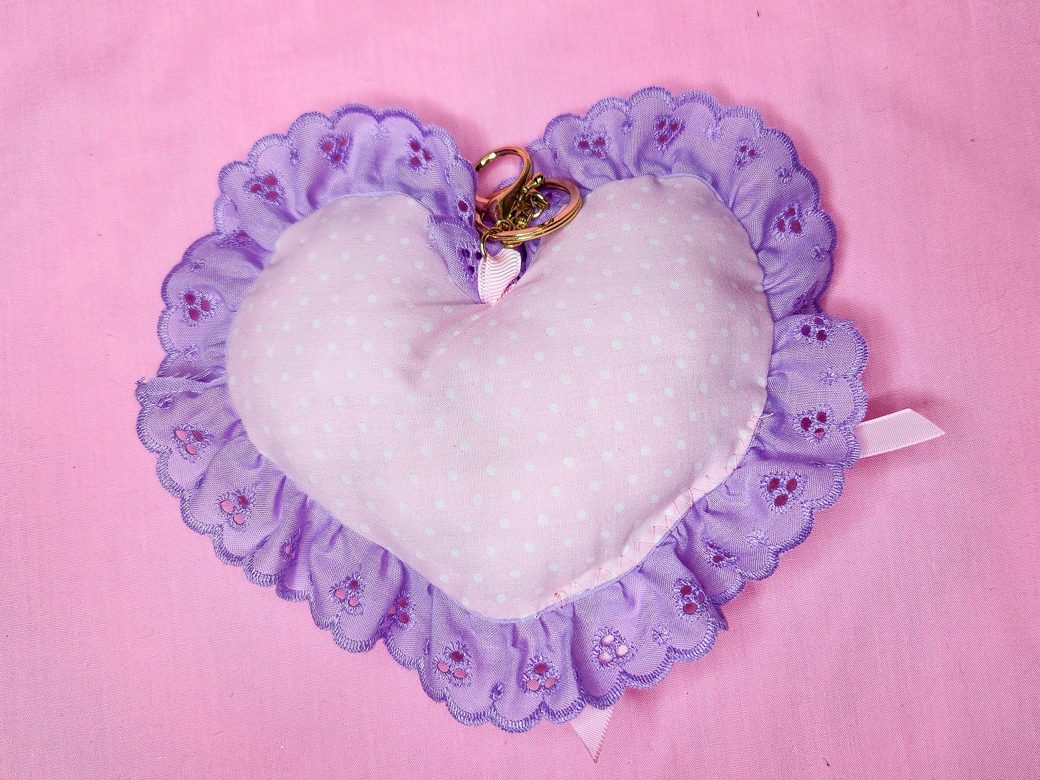 💖 MATERIALS: A plush heart bag charm made with an imported Japanese oxford cotton fabric! Mint green with the most precious pastel Conversation Hearts and unicorns! Backed in pink polka dot cotton. Edged in light lilac lace and topped off with a pink satin ribbon bow. Hangs with a goldtone lobster claw keychain.