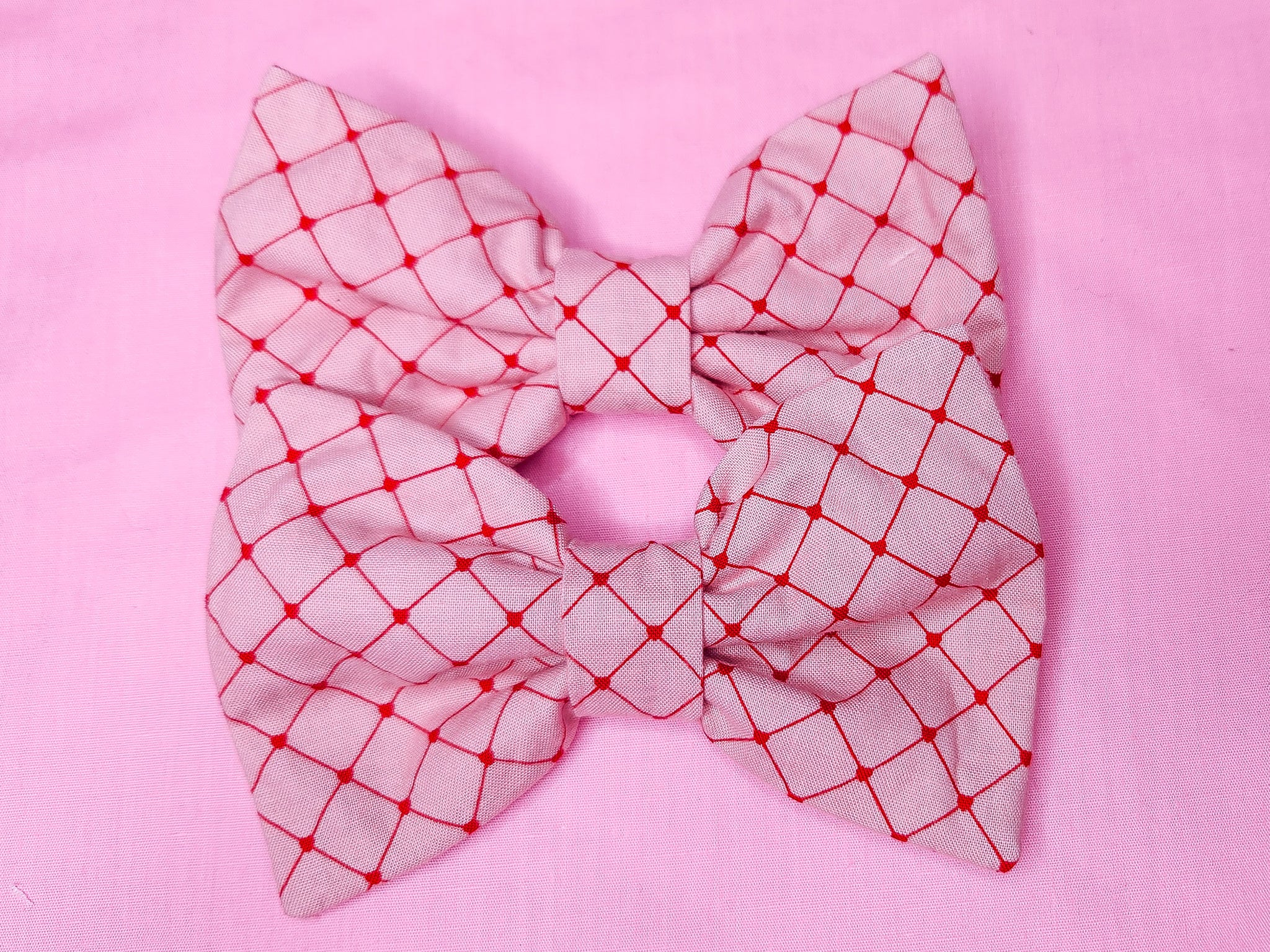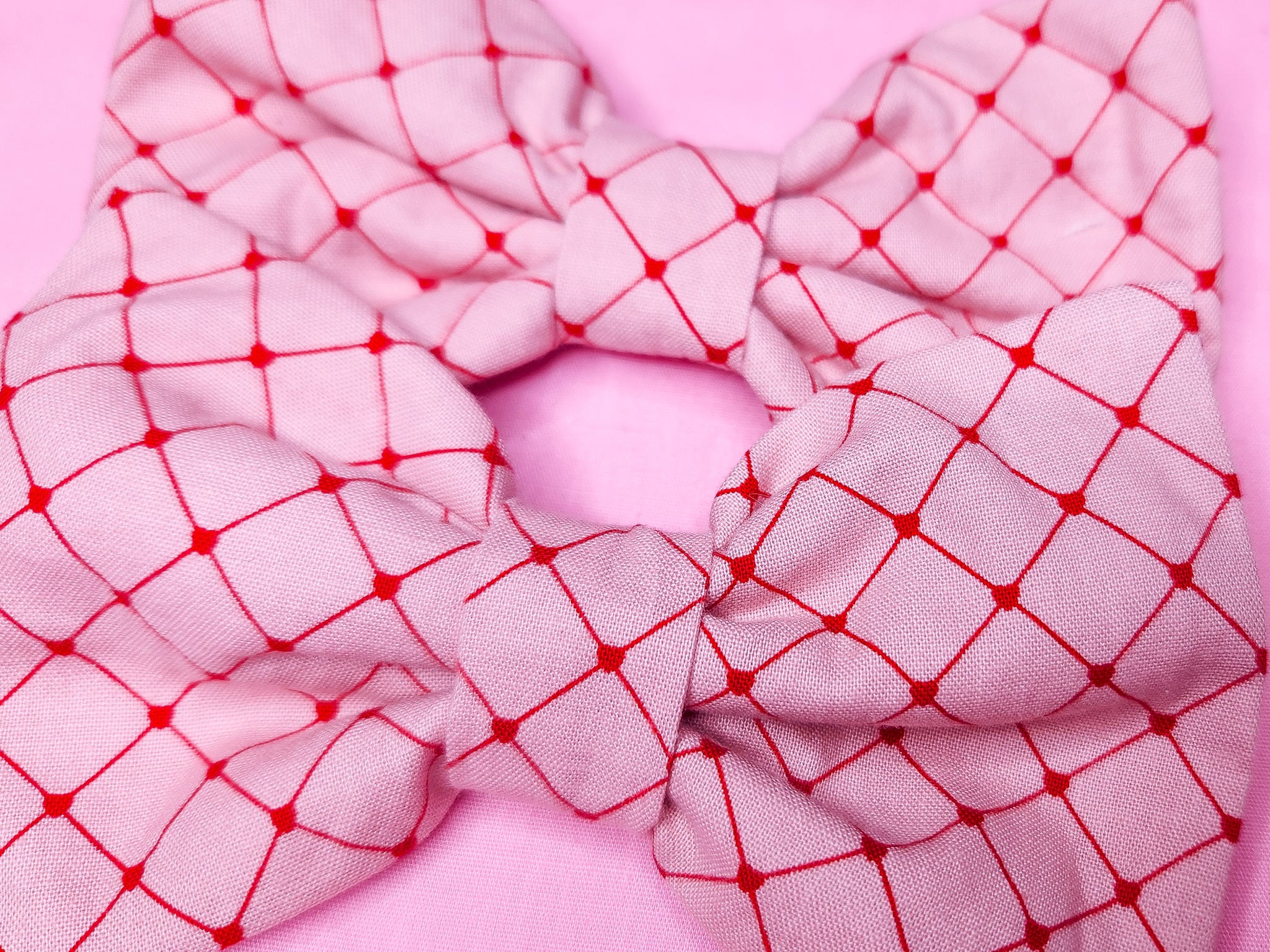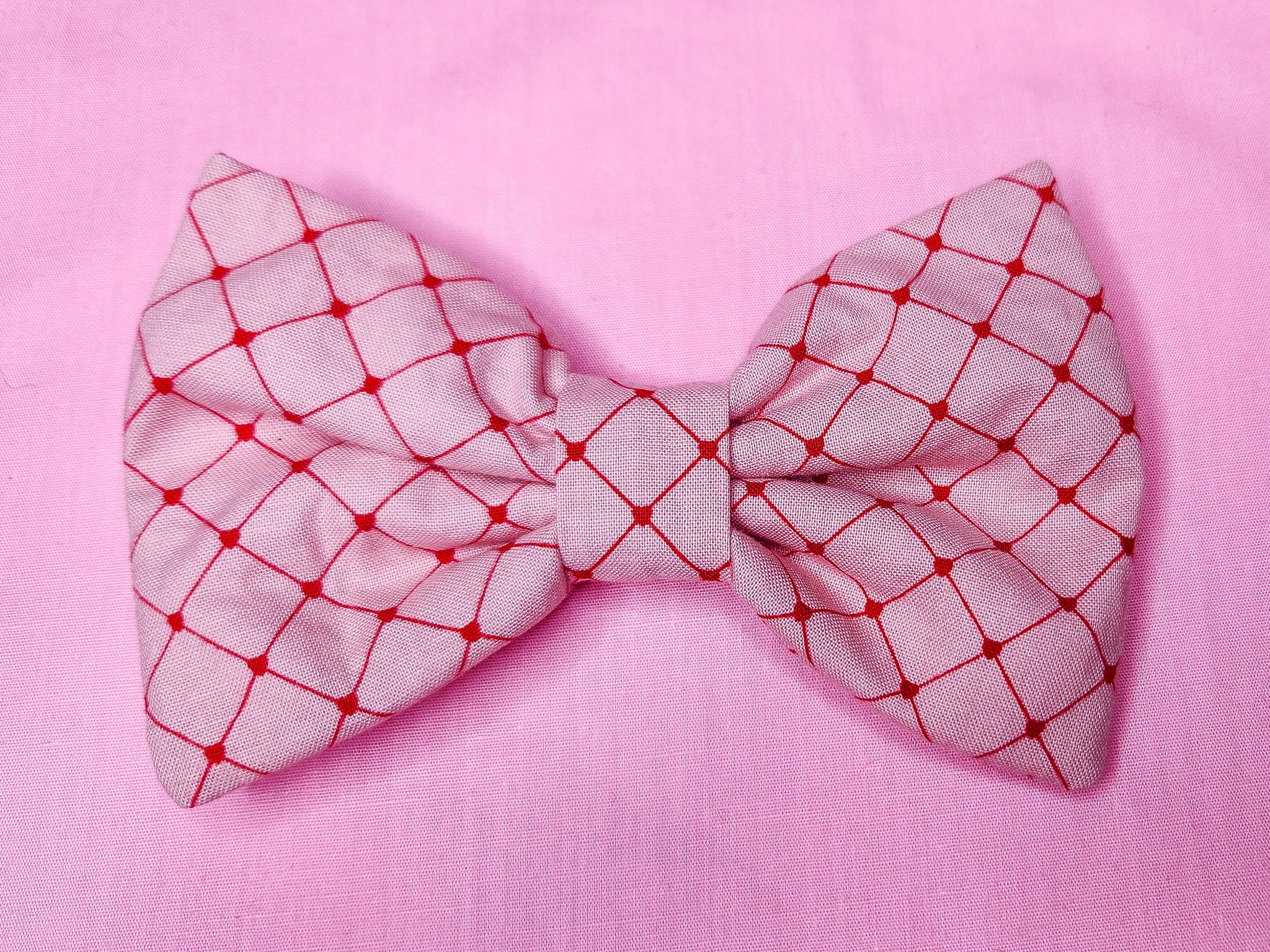 💖 MATERIALS: Pink quilting cotton with a faux crisscross quilted/tufted print in red with hearts! Fastens with alligator clip. Wear in your hair, on your bags, or as a bow tie!