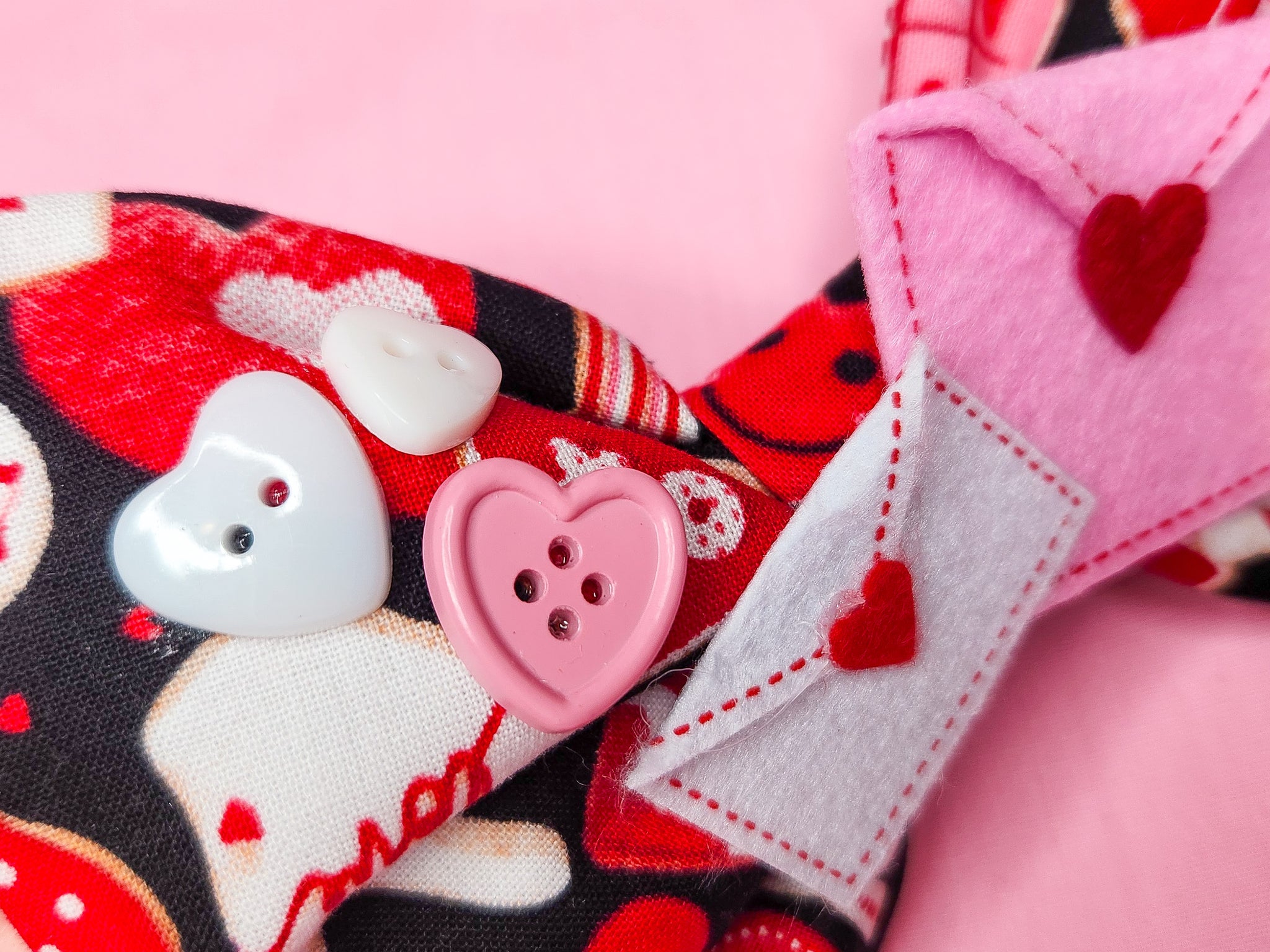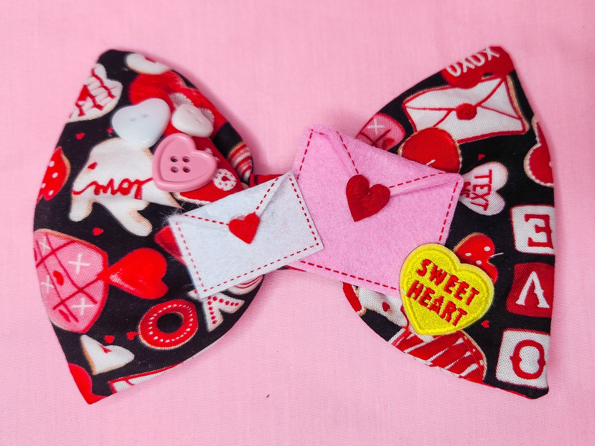 💖 MATERIALS: Black quilting cotton with a Valentine cookie print! Topped off with felt heart envelopes, an embroidered Conversation Heart patch, and three heart buttons! Fastens with alligator clip. Wear in your hair, on your bags, or as a bow tie!