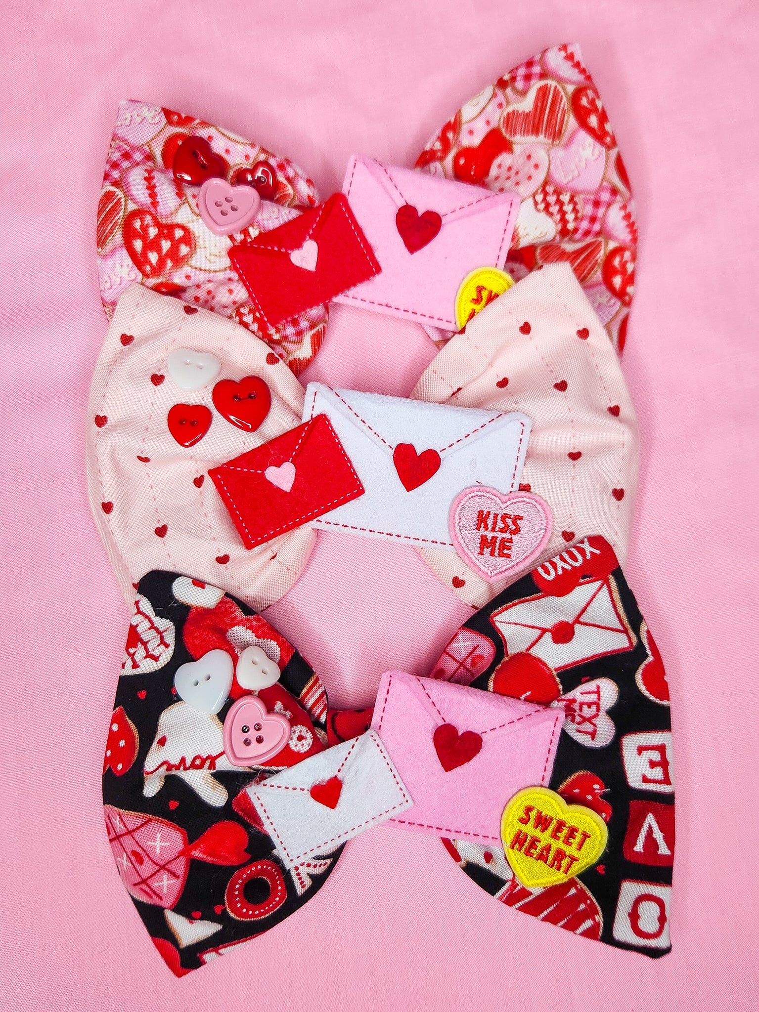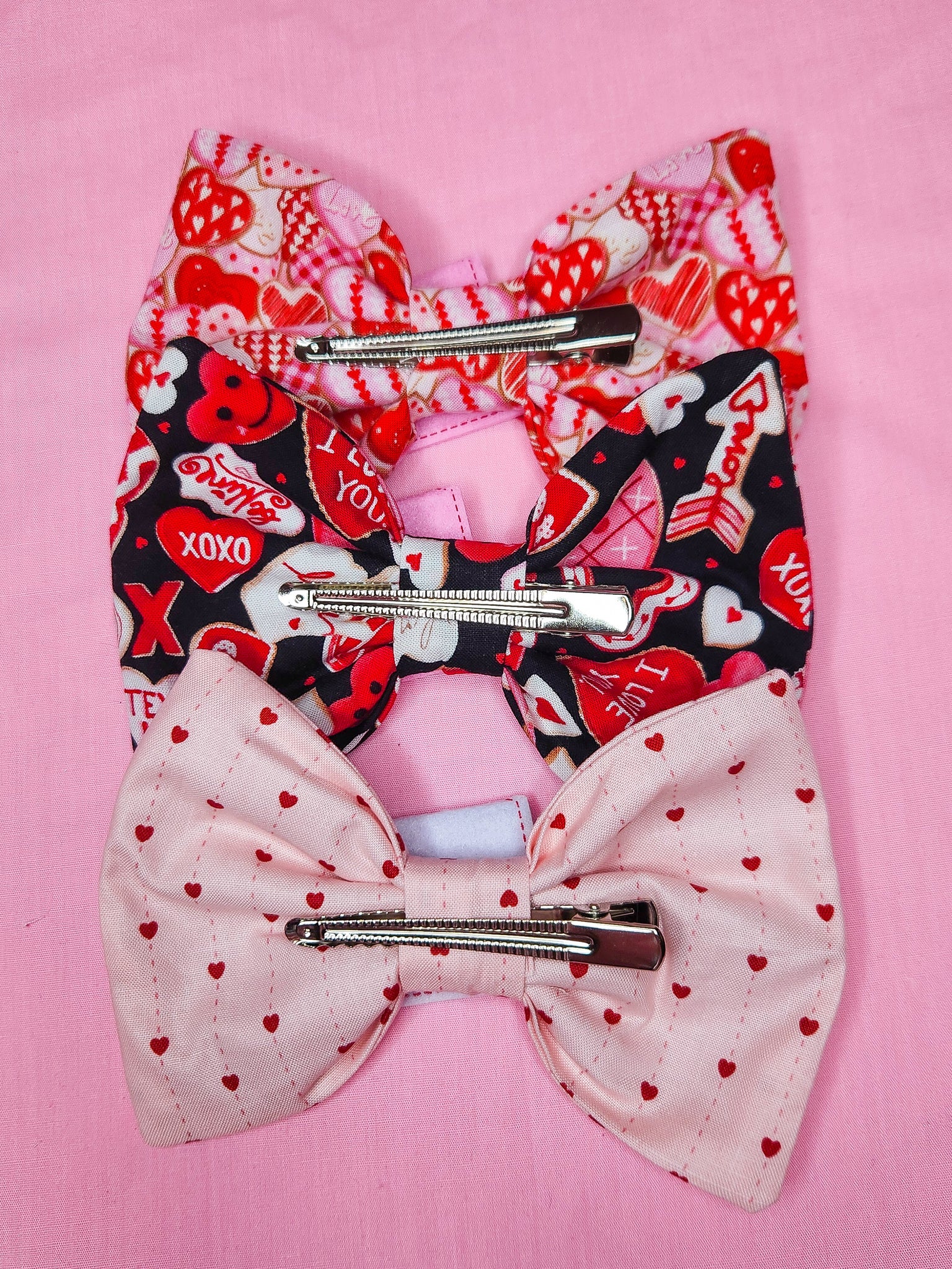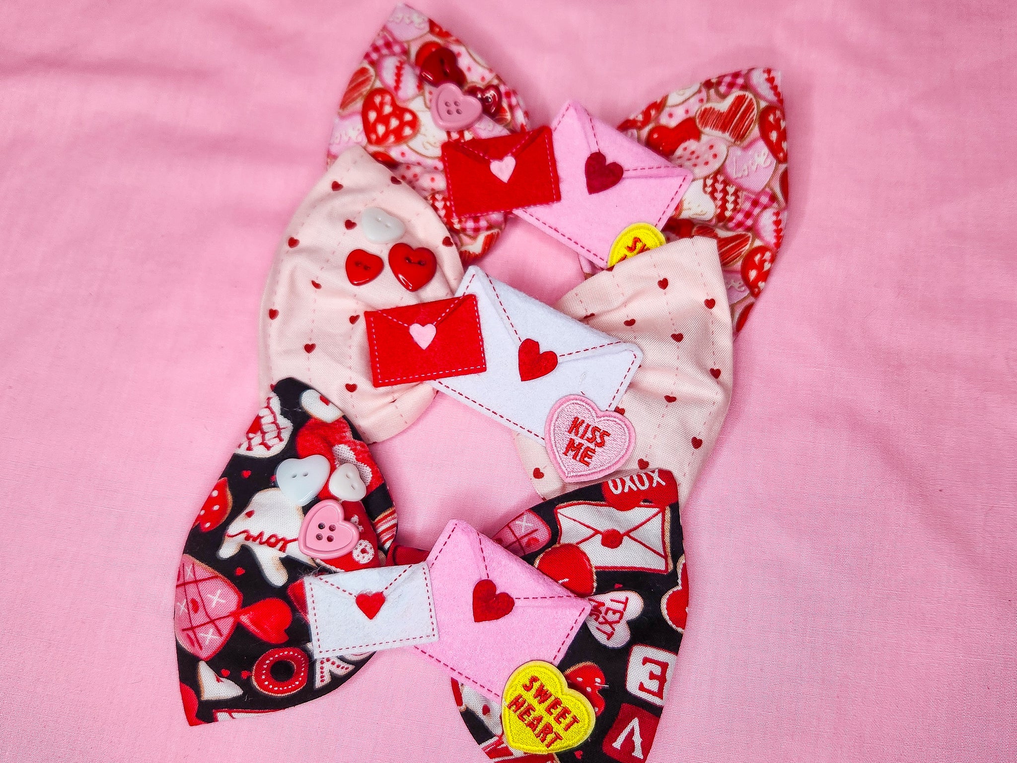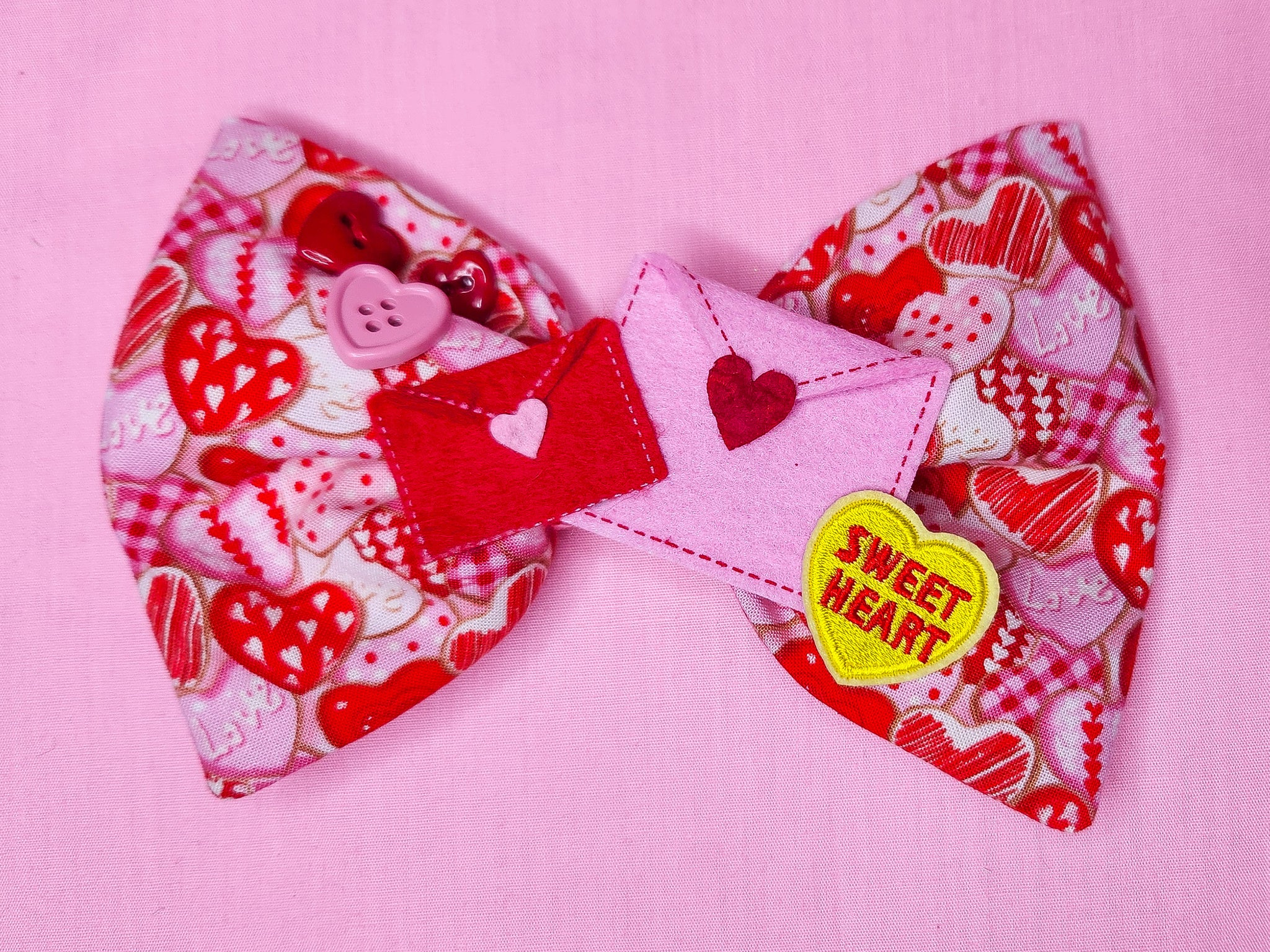 💖 MATERIALS: A quilting cotton with a delicious frosted red, pink, and white cookie print! Topped off with felt heart envelopes, an embroidered Conversation Heart patch, and three heart buttons! Fastens with alligator clip. Wear in your hair, on your bags, or as a bow tie!