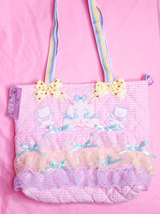 Pink gingham retro animal pastel ruffle iridescent lace quilted tote bag