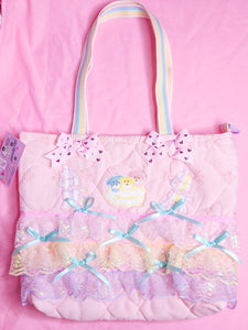 Pink eyelet retro animal pastel ruffle iridescent lace quilted tote bag
