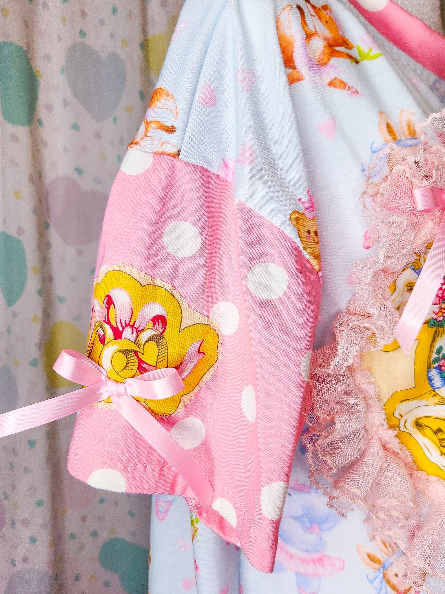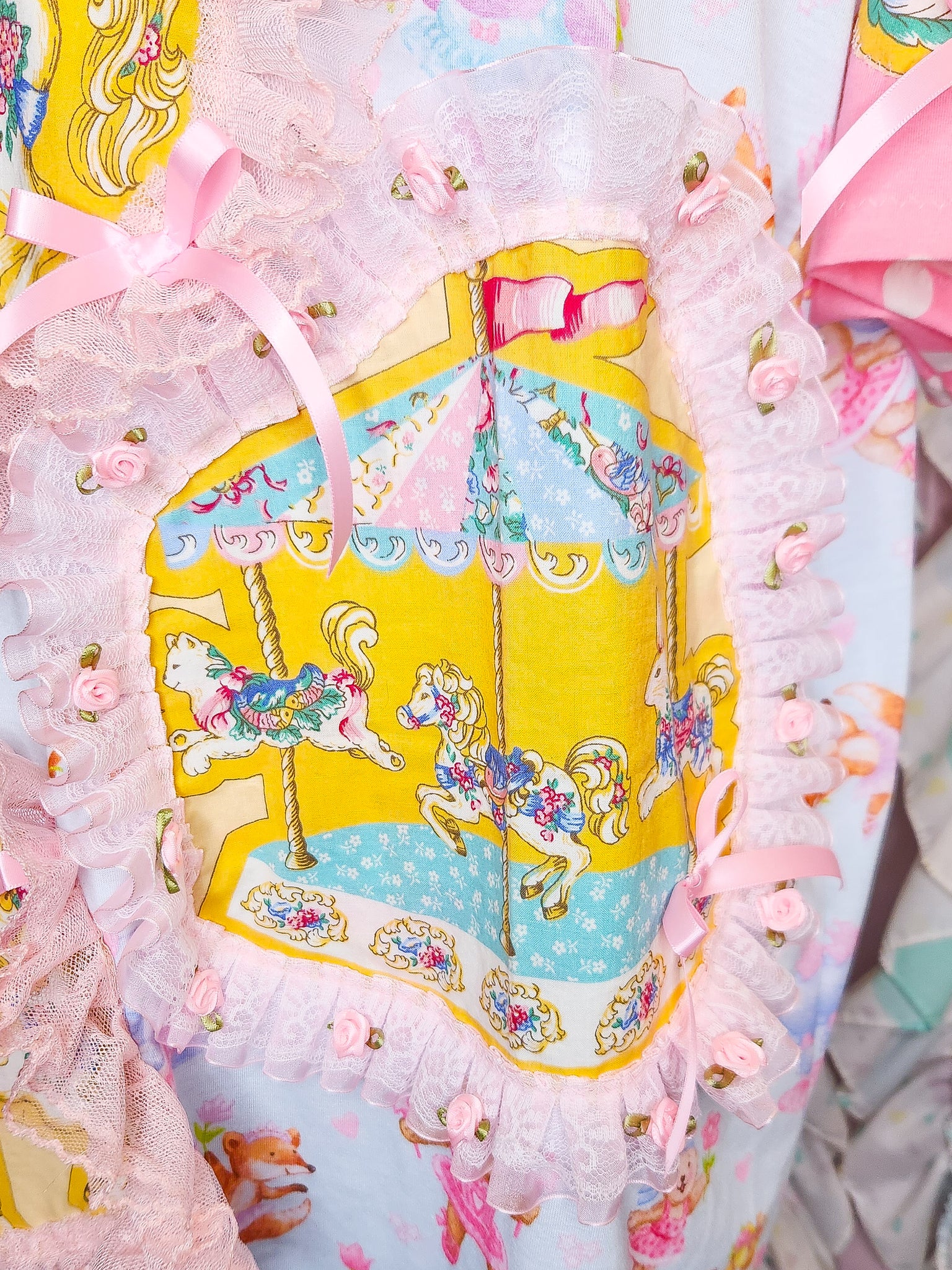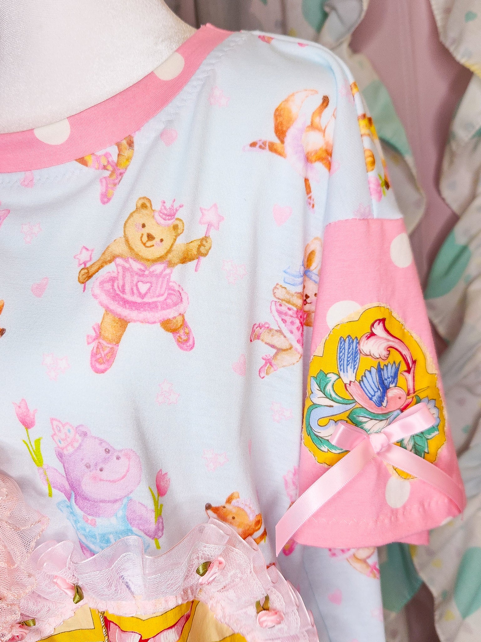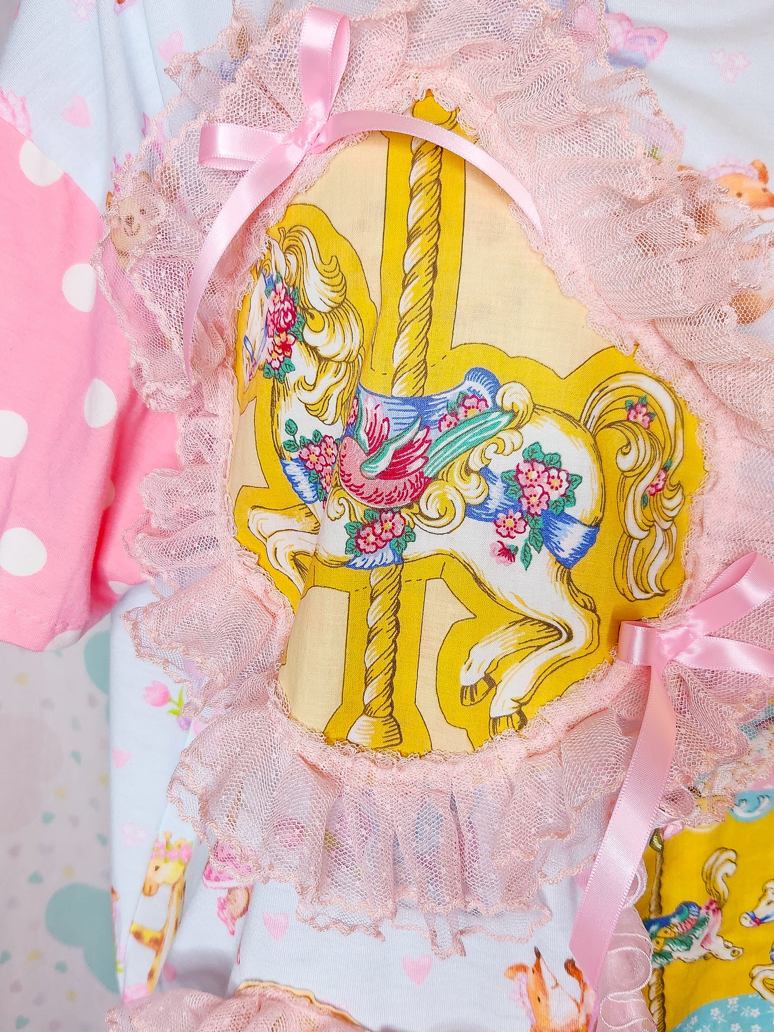 💖 MATERIALS: This blue cotton/poly cotton knit shirt has a slightly oversized fit with the most magical animal ballerina print! Bright pink polka dot cotton contrast sleeves and neckline! Vintage carousel horses appliqued on front, trimmed in pink ruffles and topped off with pink ribbon bows! Sleeves are appliqued with coordinating accents and pink bows as well!