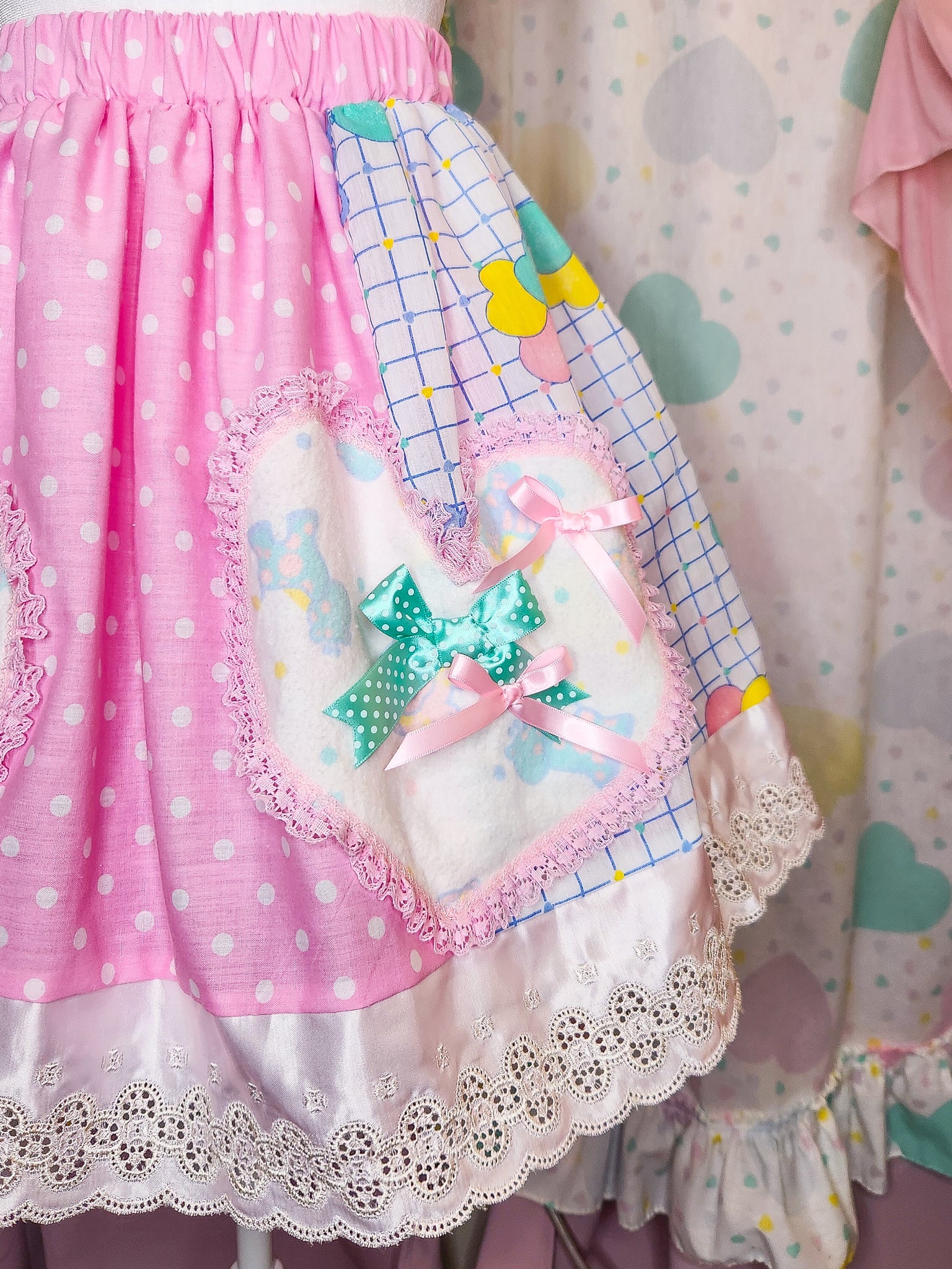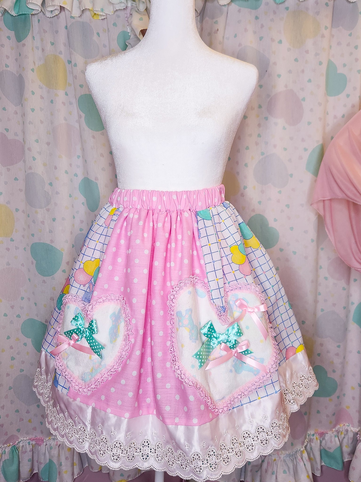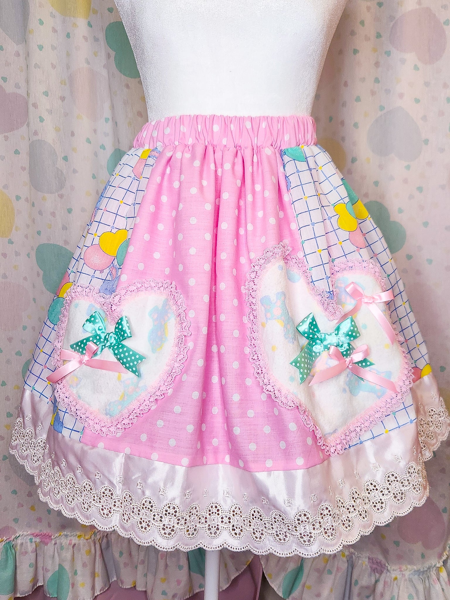 💖 MATERIALS: This paneled Spank! kei skirt features pink and white polka dots, and the most 90's nursery grid print with bunnies and balloons! Edged in super wide deadstock satin eyelet trim. Two large vintage nursery flannel heart appliques on front, with ribbon bows scattered! Elastic waist. Petticoat not included!
