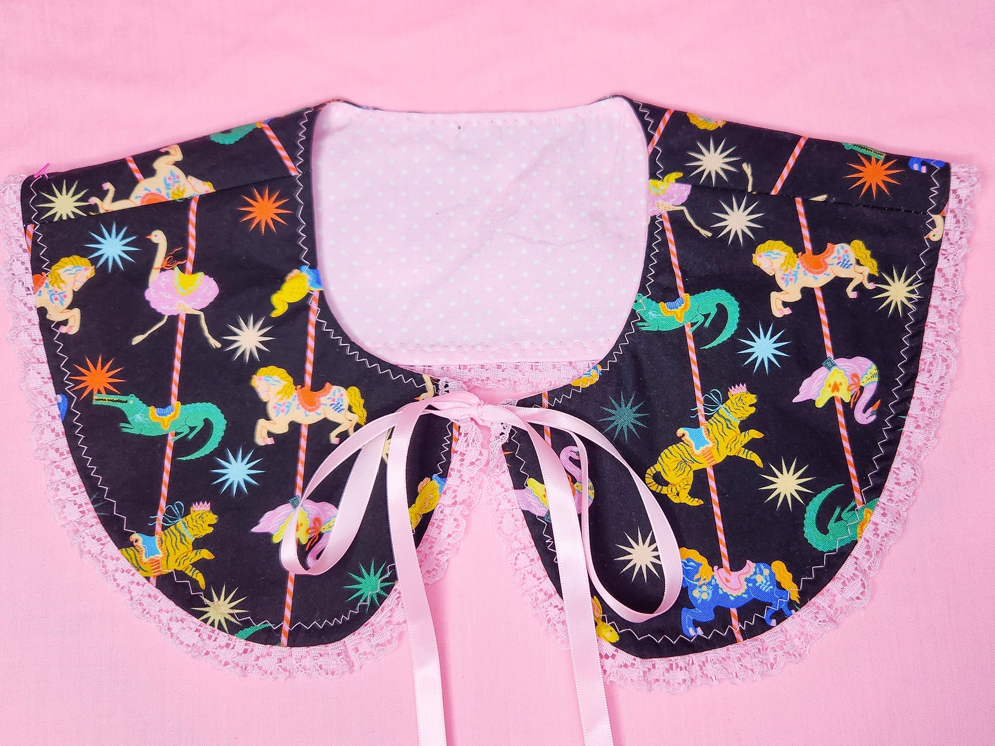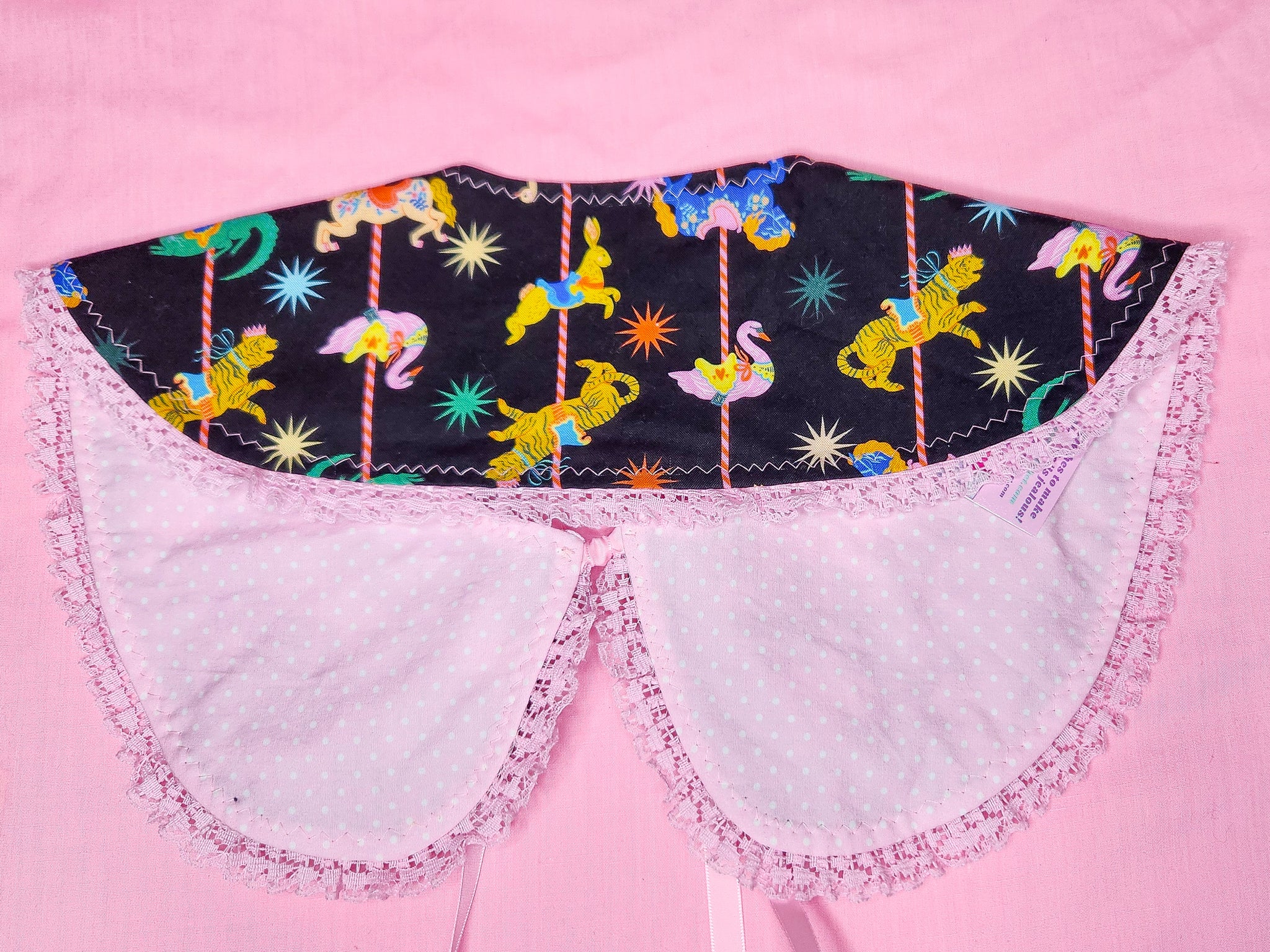 💖 MATERIALS: Black quilting cotton fabric with a super colorful carousel print with all kinds of animals! Pink polka dot cotton/poly lining. Pink ruffle lace, ties with pink ribbons!