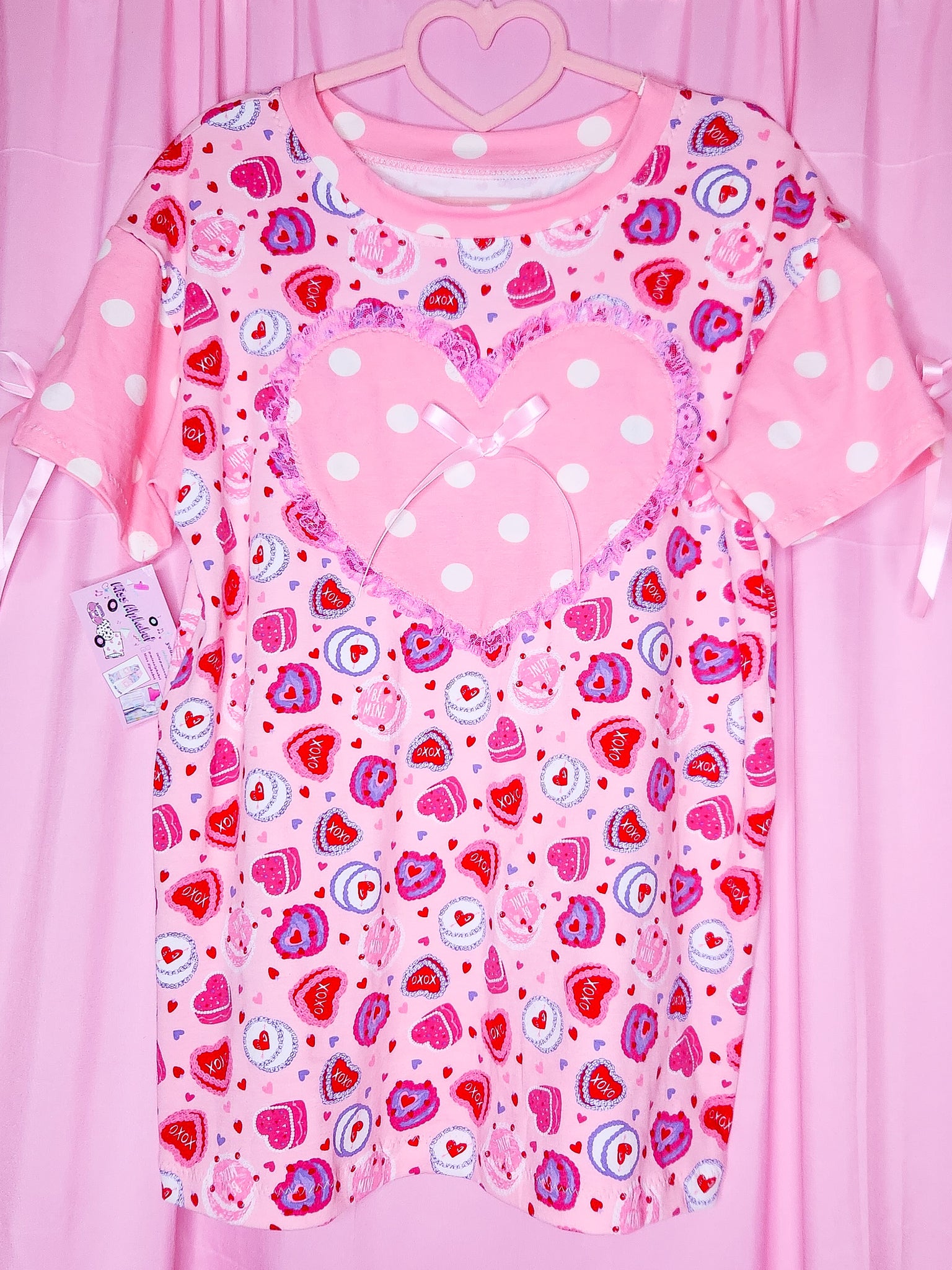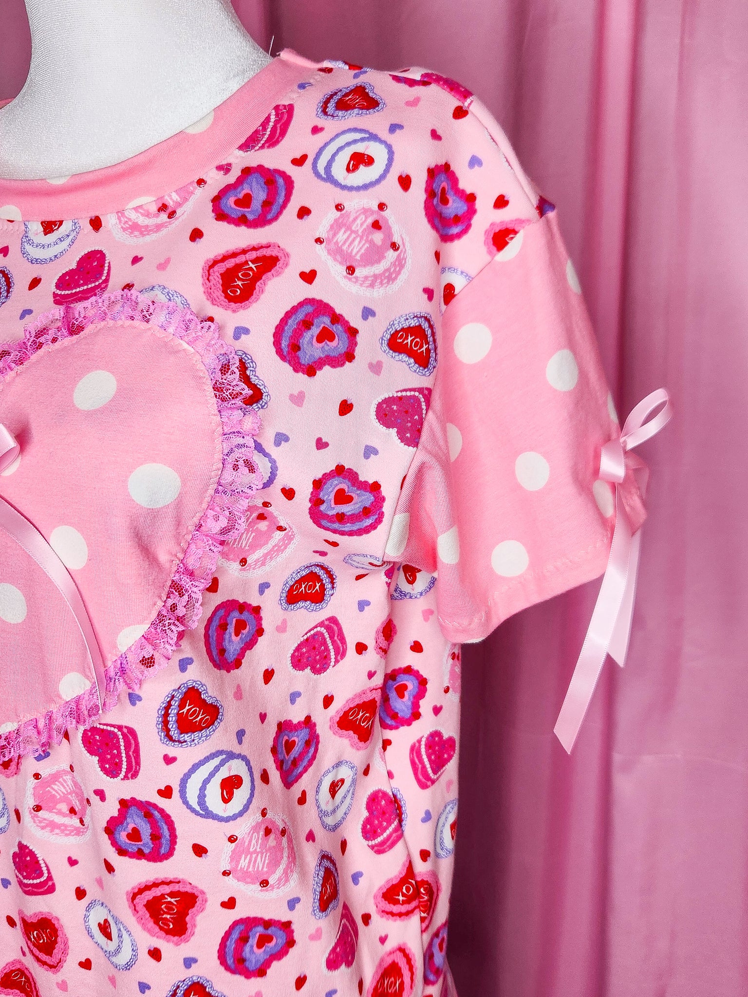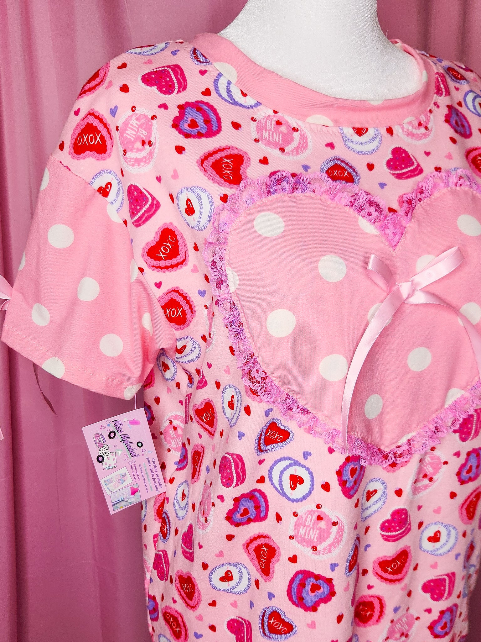 π MATERIALS: This pullover boxy top is made of a super soft cotton/spandex knit fabric covered in Valentine heart cakes! Contrast sleeves and front heart applique in pink and white polka dot knit, which is edged in pink gathered lace! Topped off with pink satin ribbon bows!