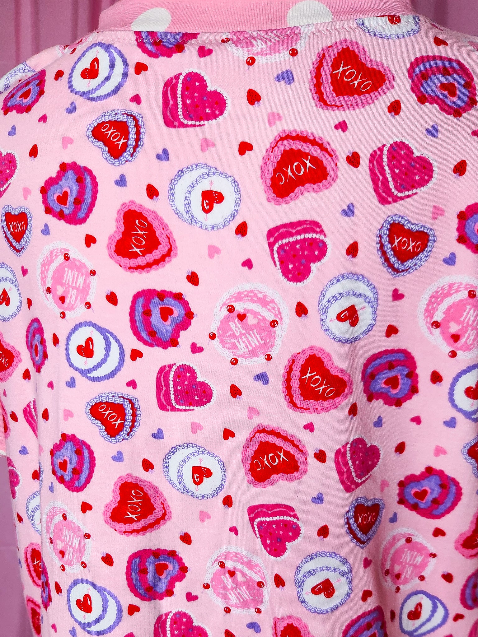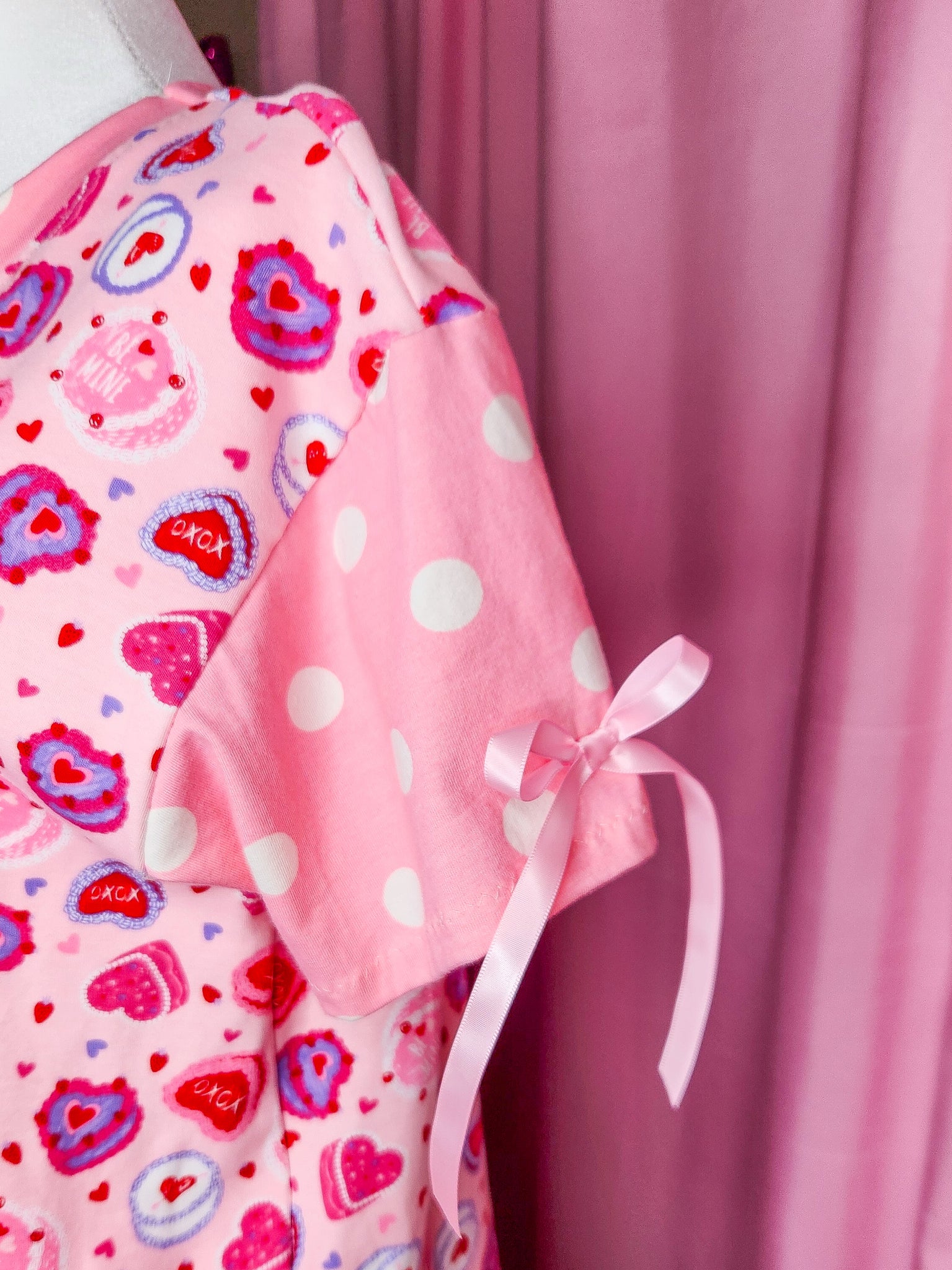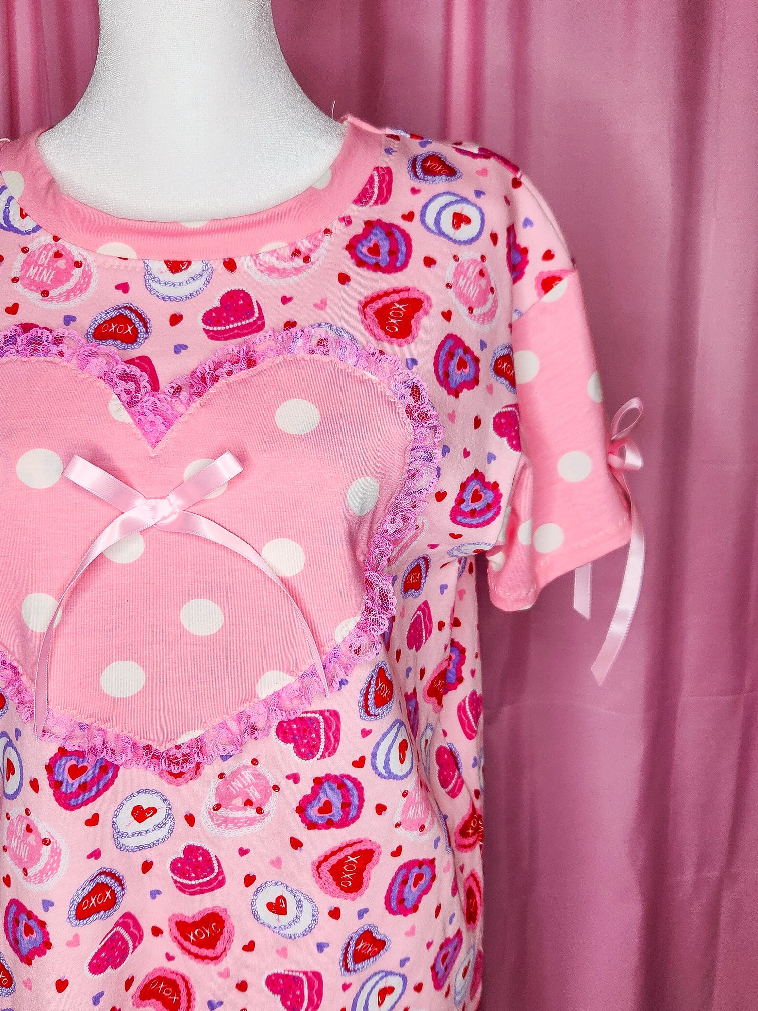 π MATERIALS: This pullover boxy top is made of a super soft cotton/spandex knit fabric covered in Valentine heart cakes! Contrast sleeves and front heart applique in pink and white polka dot knit, which is edged in pink gathered lace! Topped off with pink satin ribbon bows!