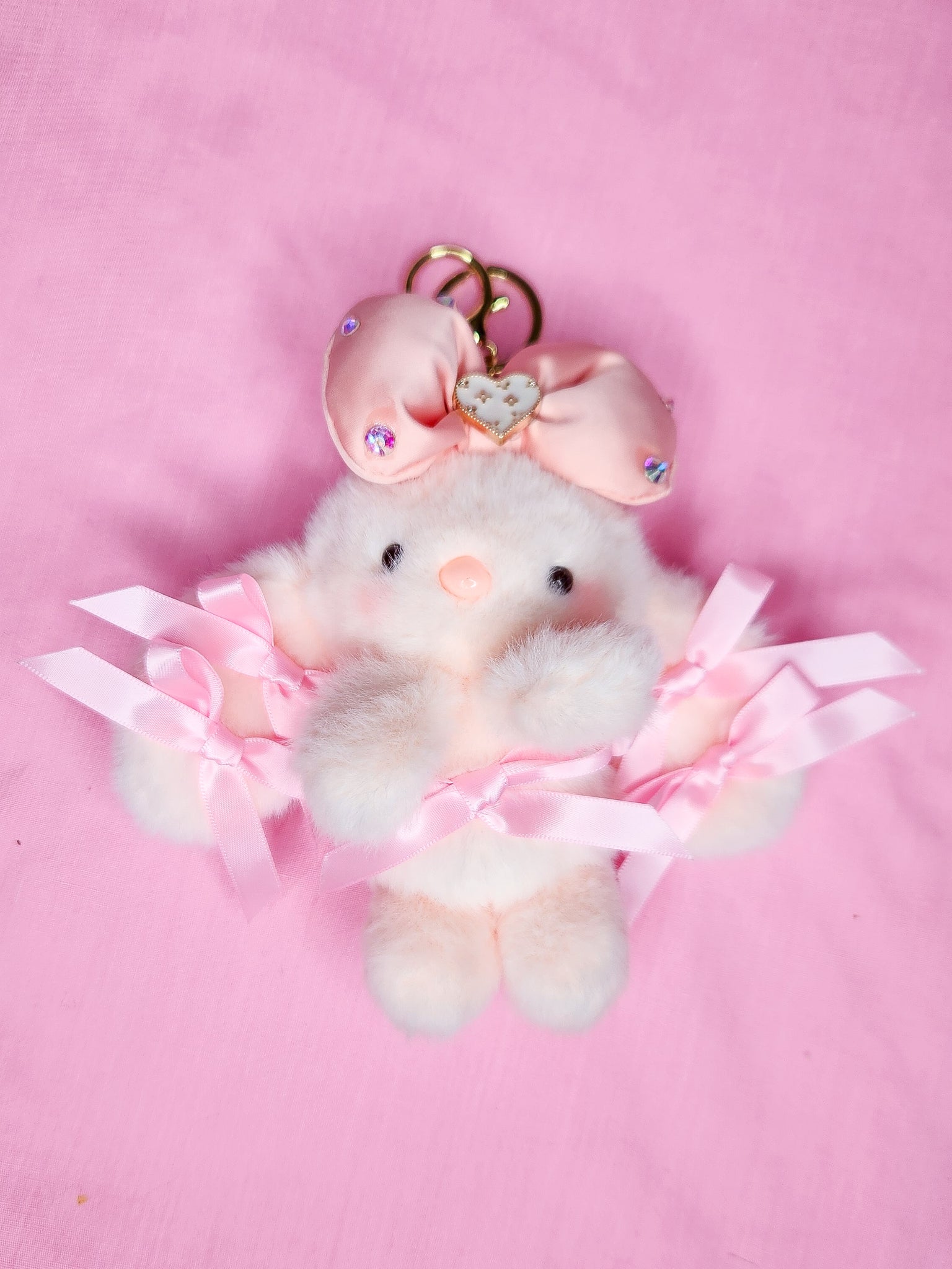 π MATERIALS: A peachy pink plush bunny bag charm decorated in pink bows and rhinestones! Enamel heart flatback tops off the blush bow on her little head. Hangs with a goldtone lobster clasp and keychain.