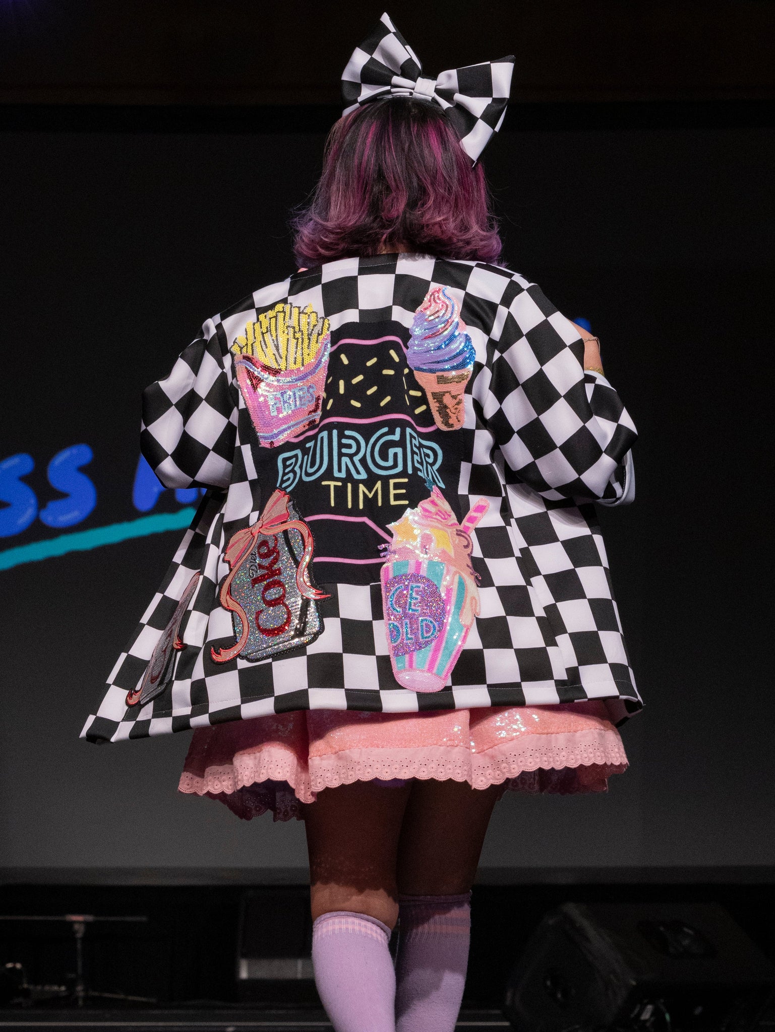 💖 MATERIALS: Inspired by the mall food court, you'll see elements of checkered floors, as well as junk food! Polyester neoprene fabric makes up this black and white checkered jacket and gives it such a new wave style! A giant sequin Diet Coke and cupcake applique on front, lots of neon and sequin foods on back! You gotta see it!
