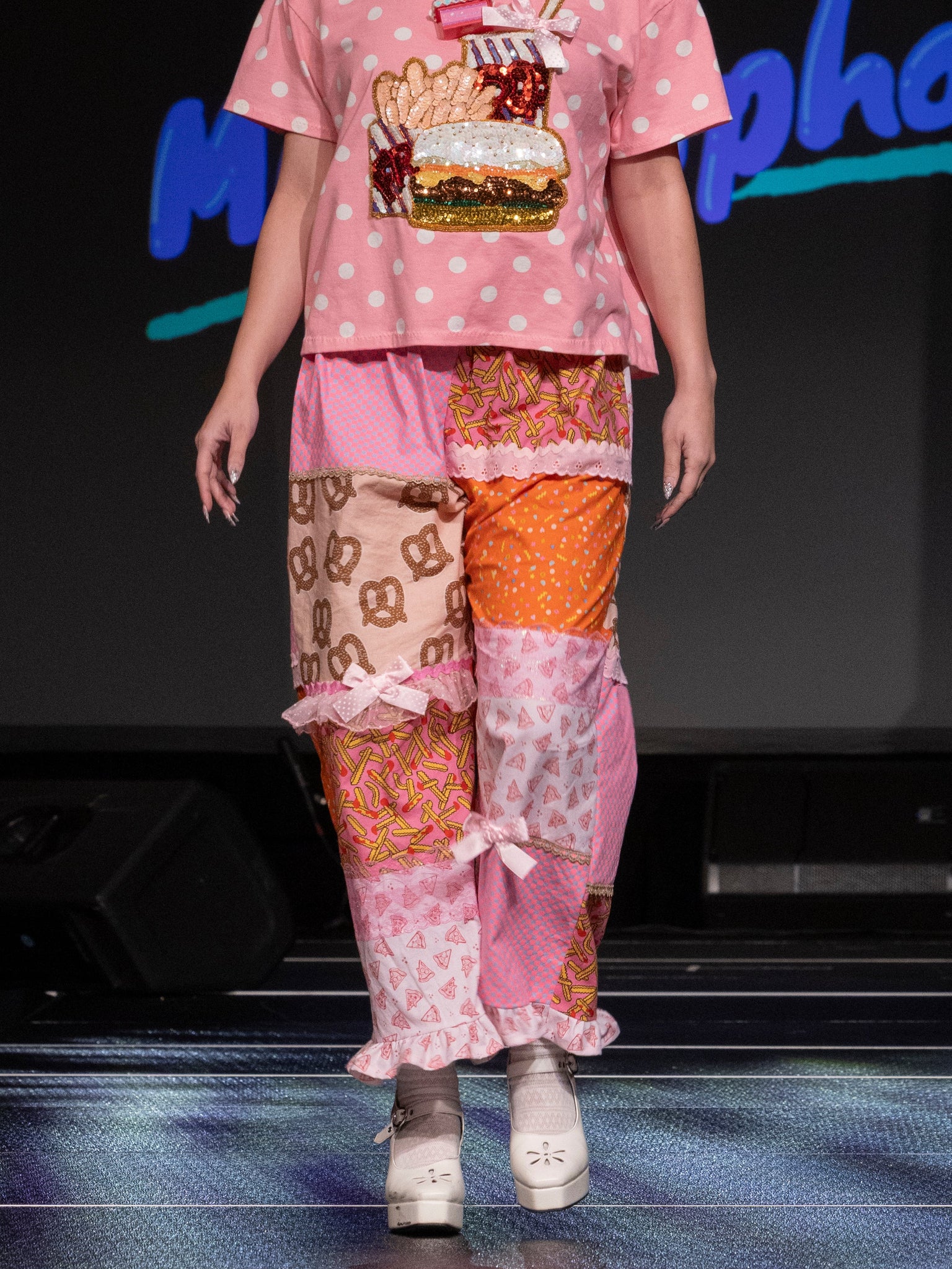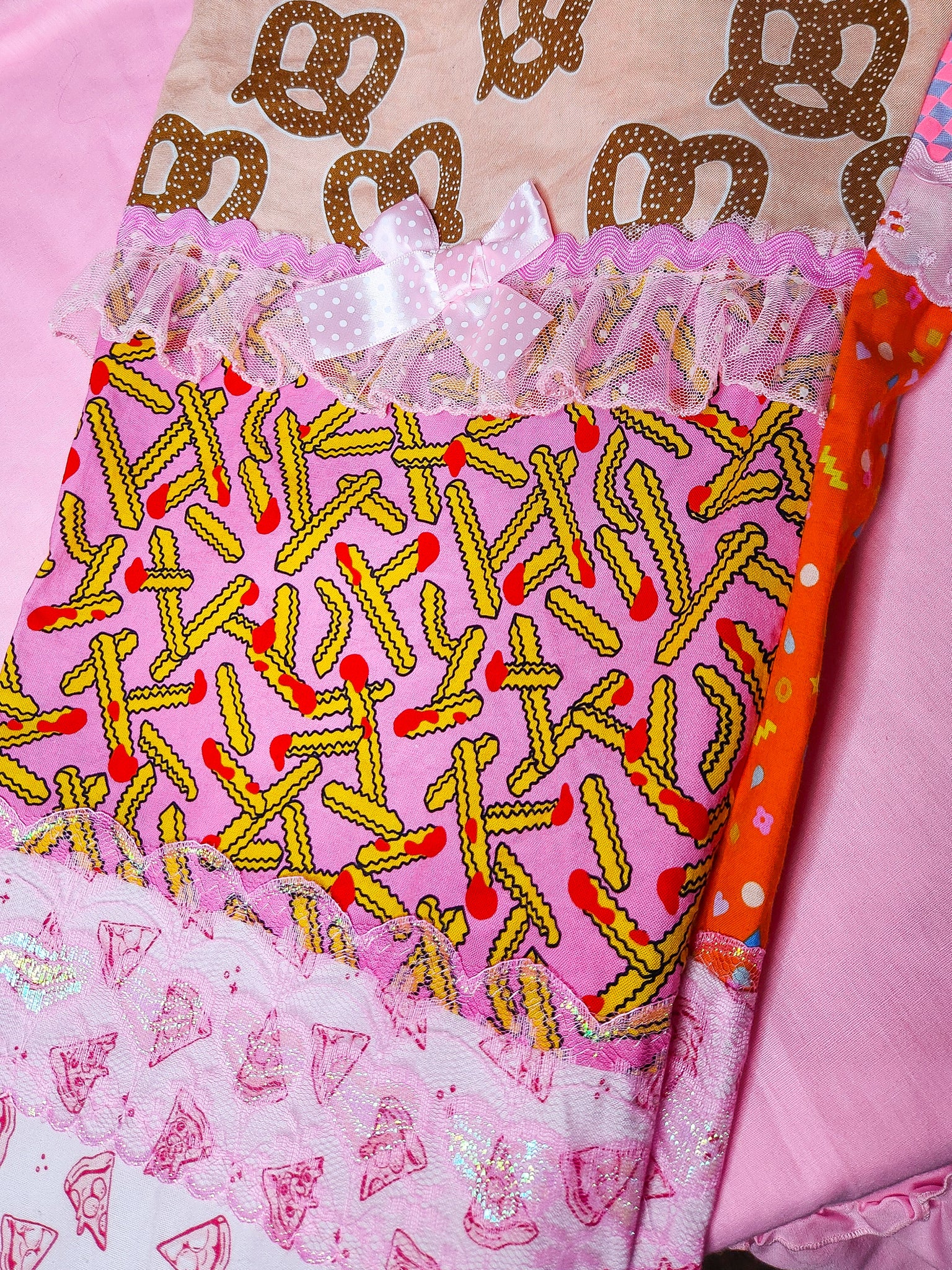 💖 MATERIALS: Inspired by the mall food court, you'll see elements of checkered floors, as well as junk food! Quilting cotton in bright orange checkers, pink pizza slices, mall pretzels, and french fries! Trims along seams, topped off with ribbon bows and pizza ruffles on bottom. Elastic waist.