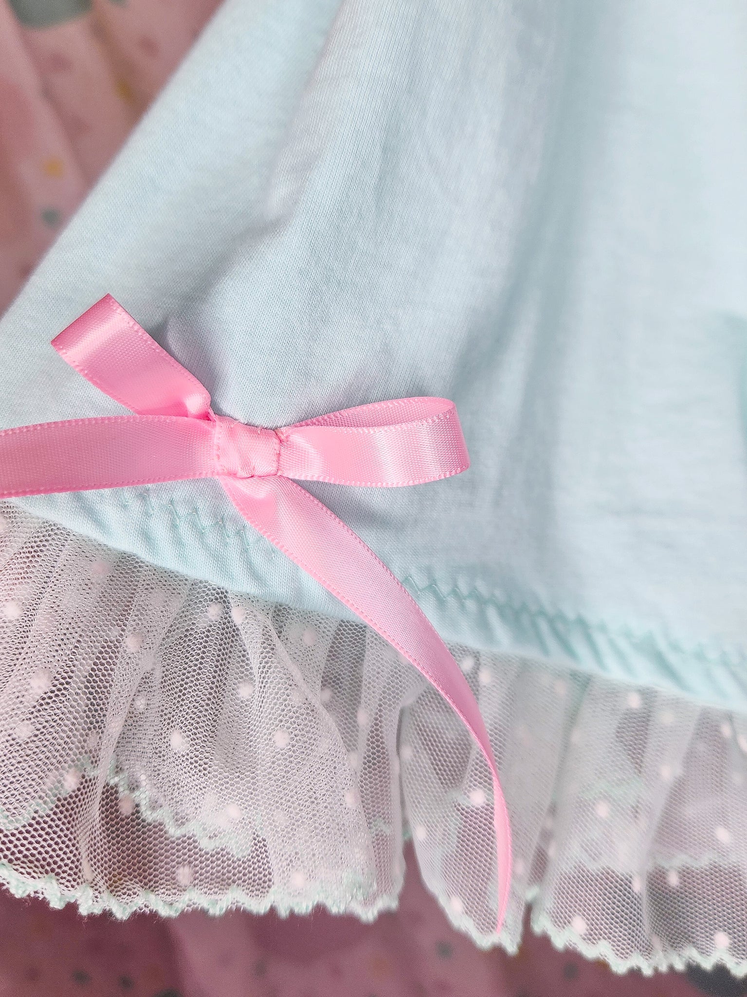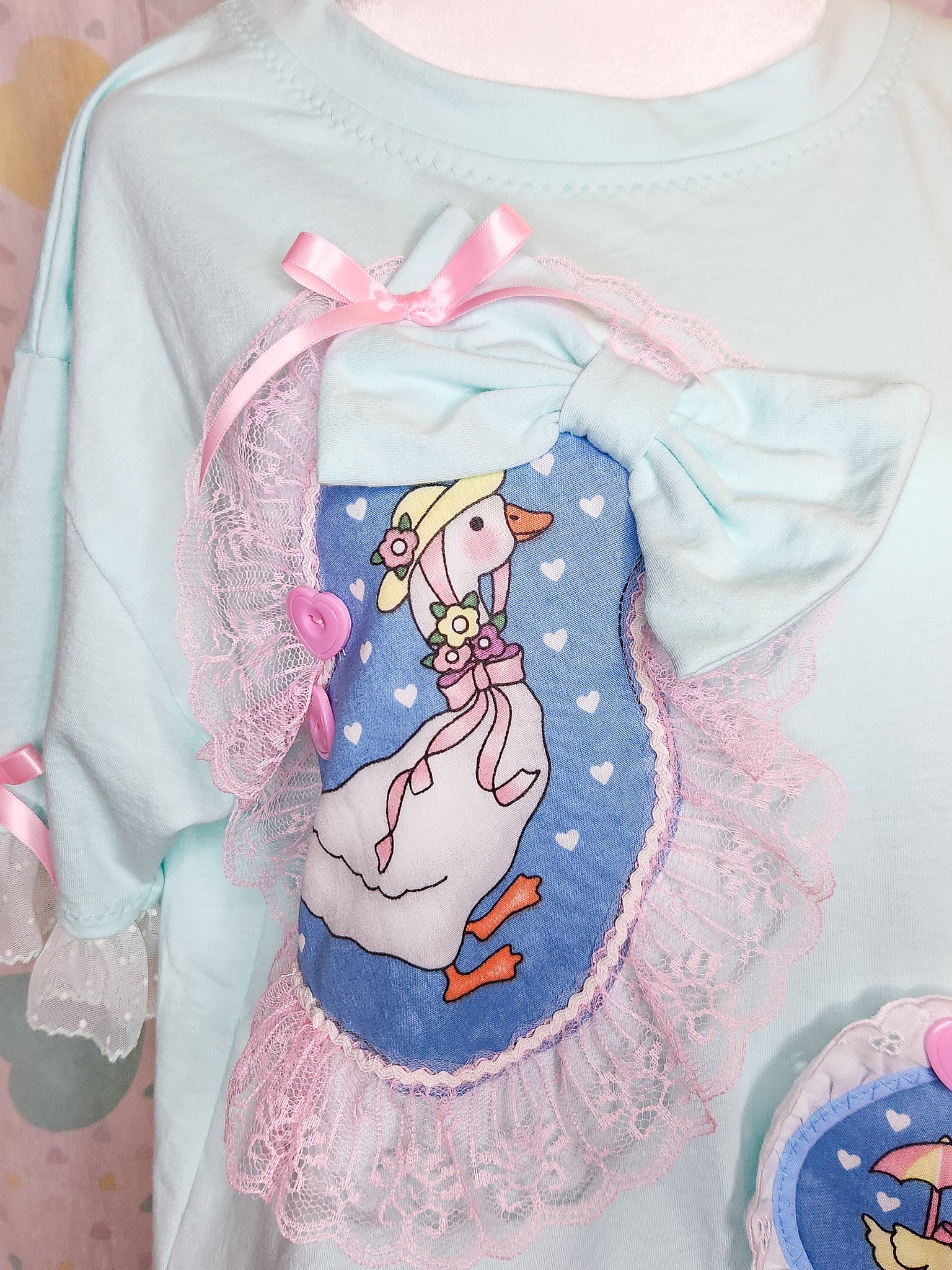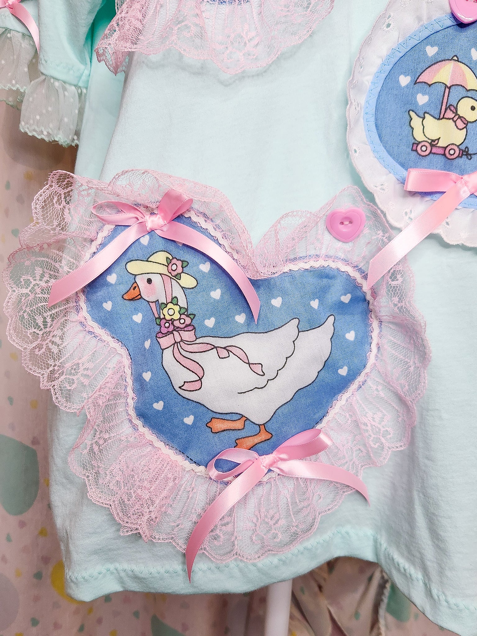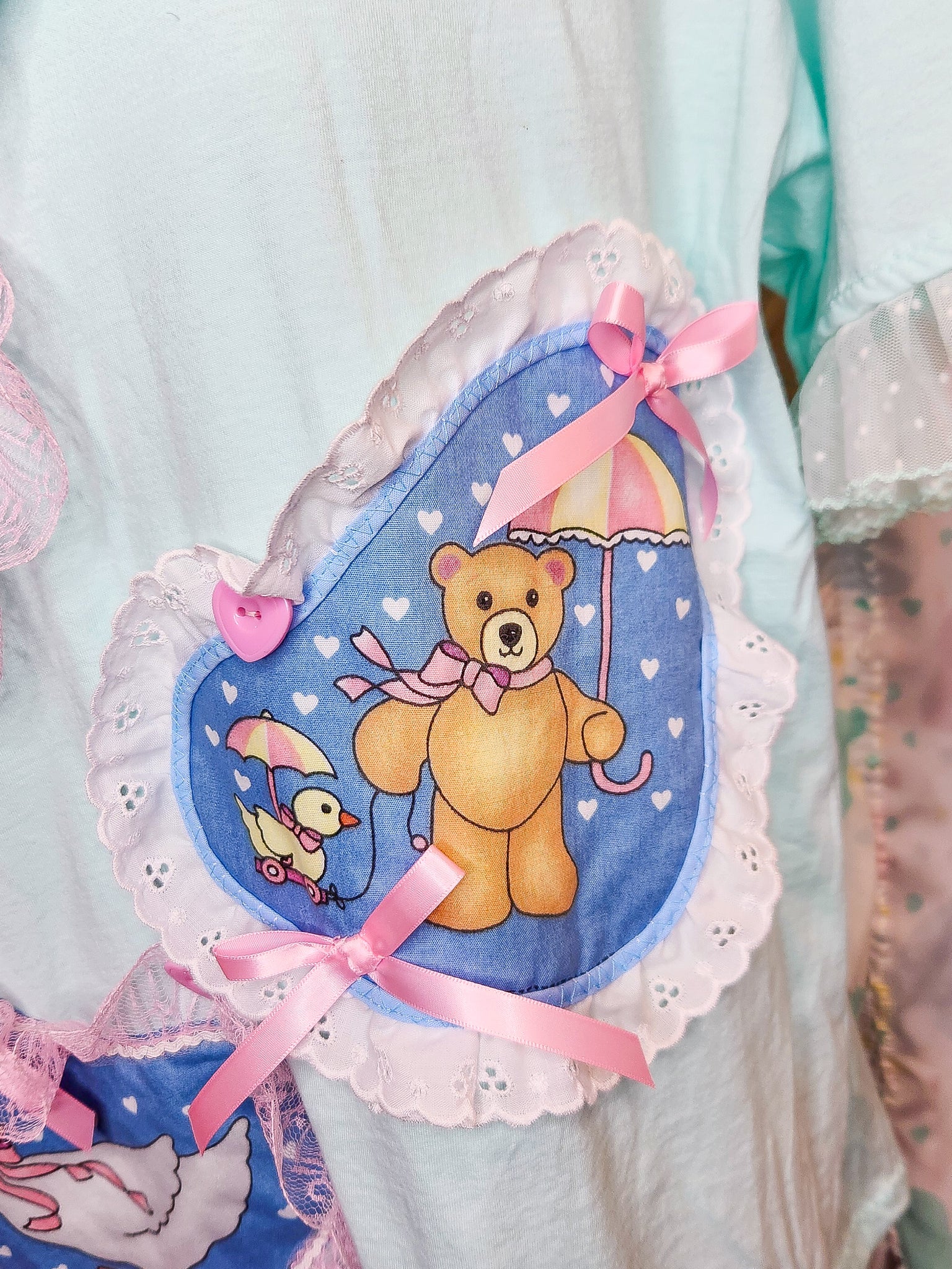 💖 MATERIALS: This mint green cotton knit shirt has a slightly oversized fit and oh, are those GEESE??? I had to do something with this early 90's fabric panel! There's even a little rainy day teddy bear! All appliques are edged in ruffled lace or eyelet and topped off with pink bows and heart buttons! Sleeves are edged in soft pink pink polka dot ruffled scallop mesh and also topped off with pink bows! This one is super fun!