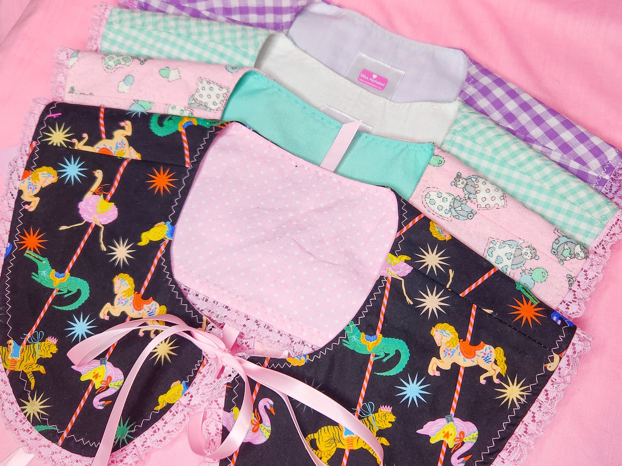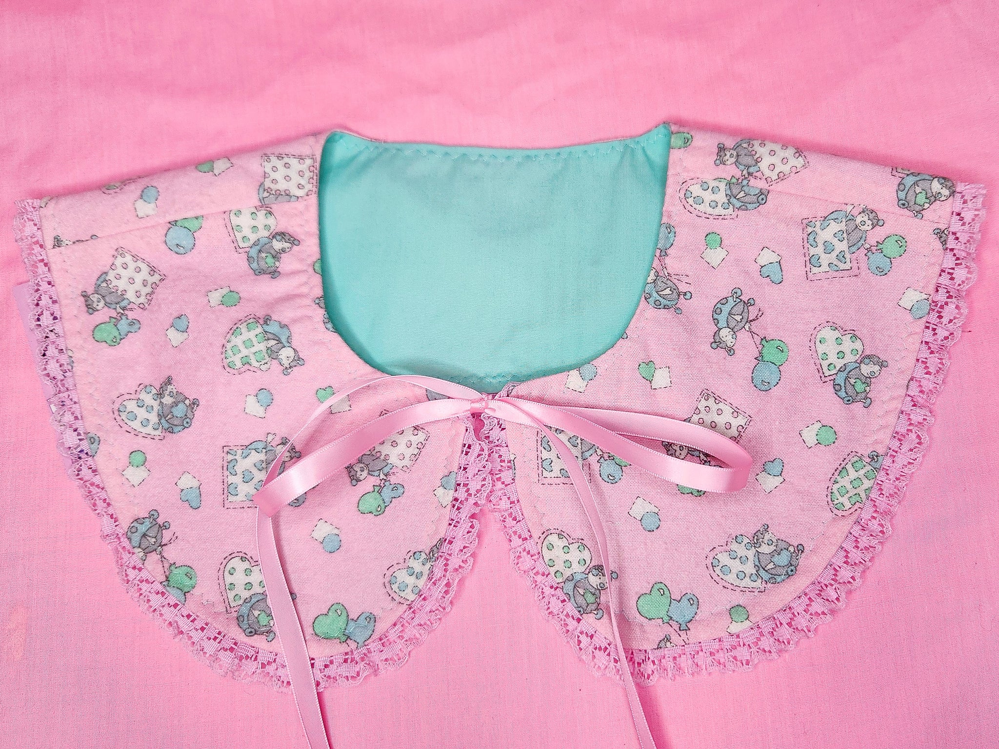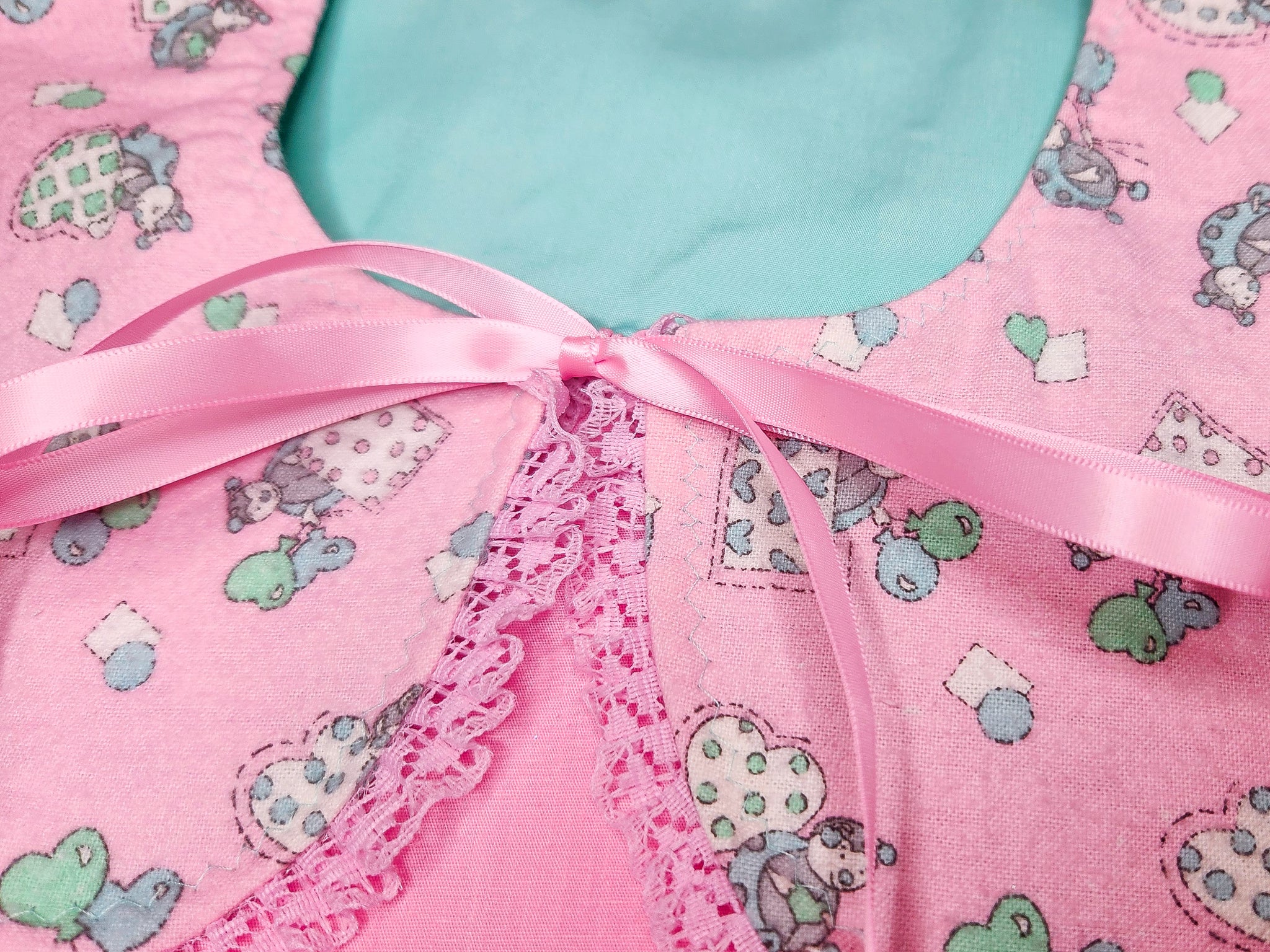 💖 MATERIALS: Pink deadstock flannel fabric with the most 90's heart balloon animal print in gray and mint! Mint green cotton/poly lining. Pink ruffle lace, ties with pink ribbons!