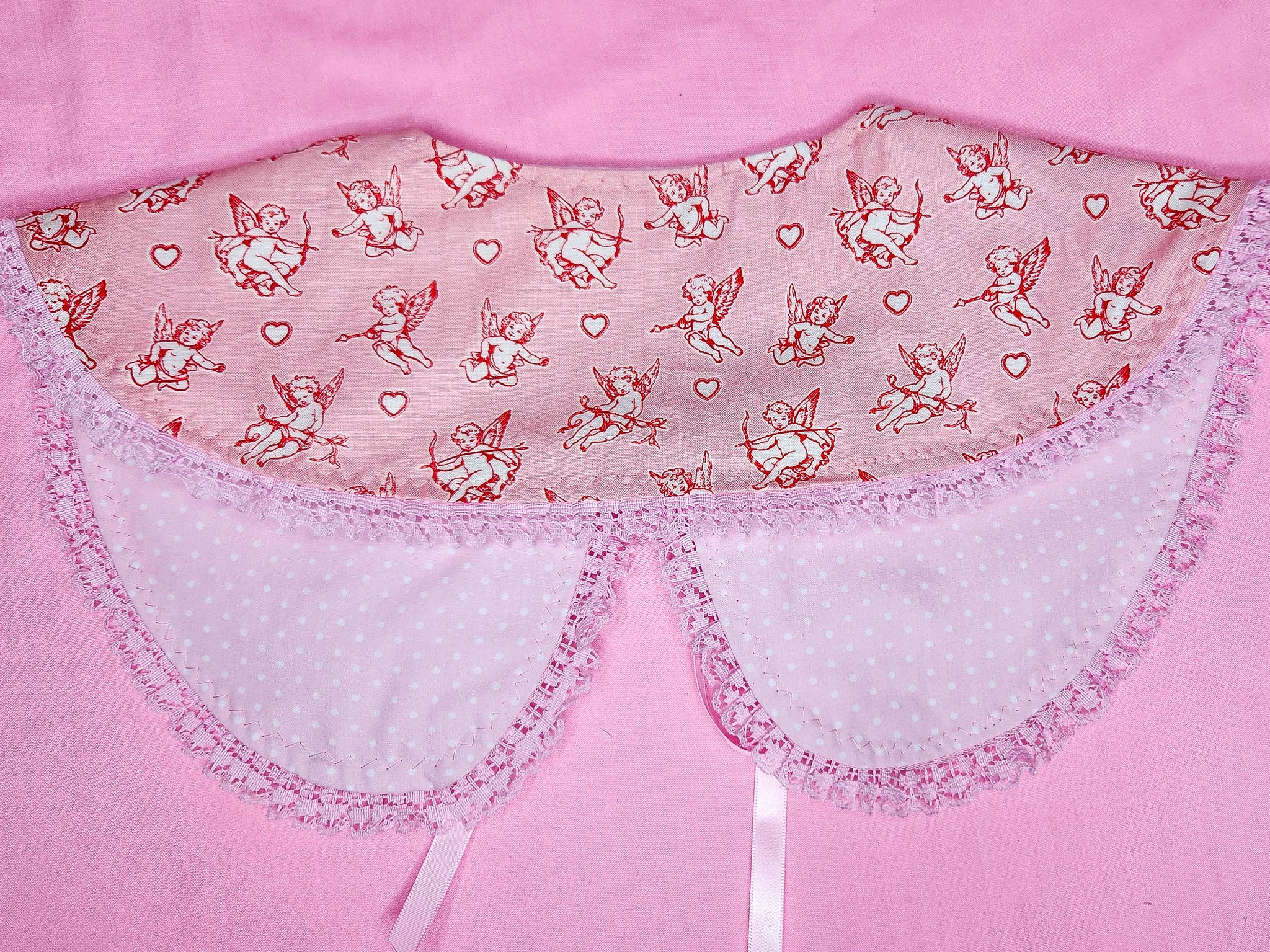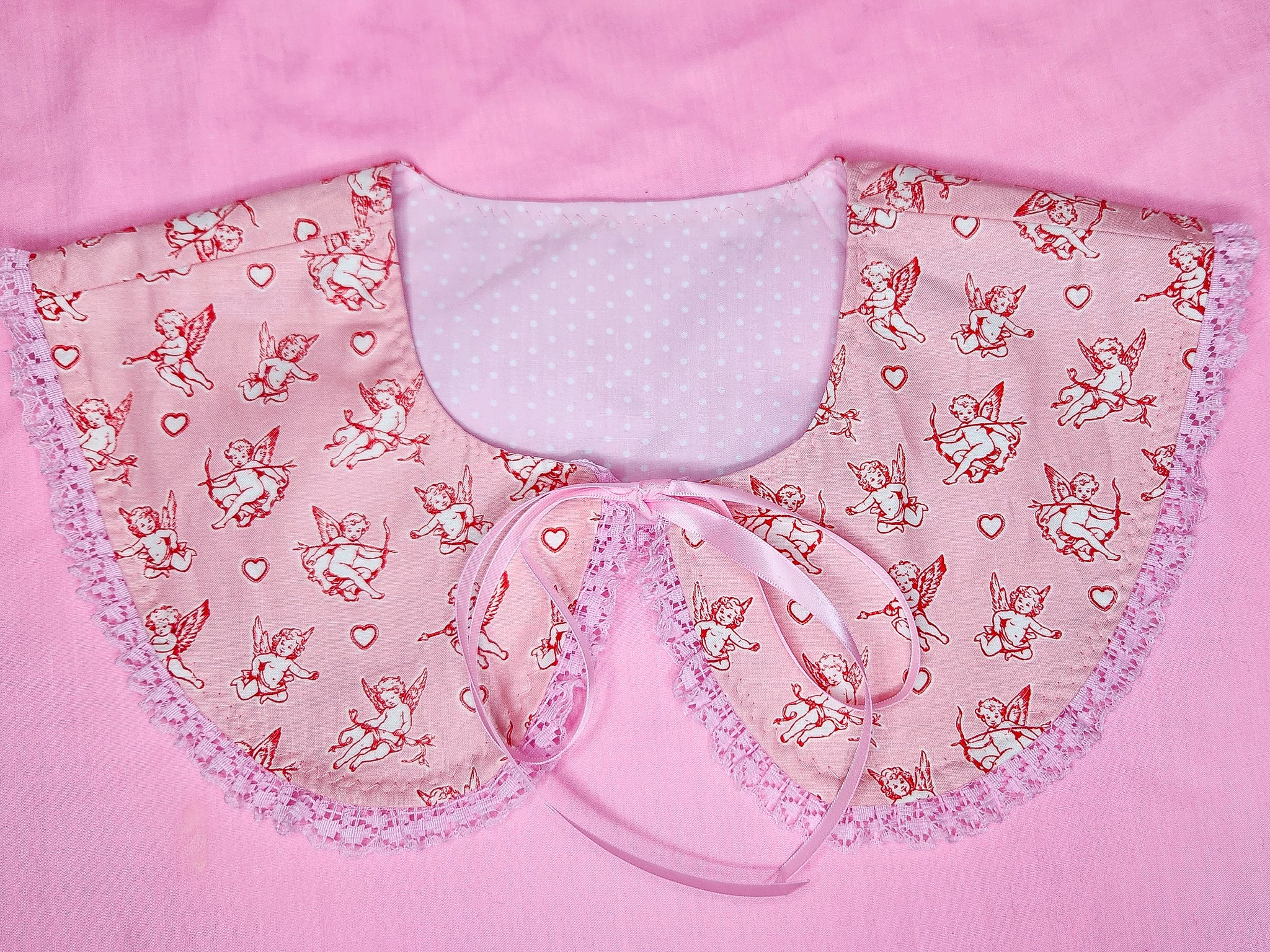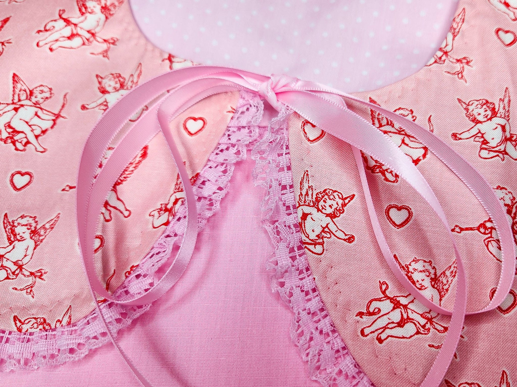 💖 MATERIALS: Pink quilting cotton fabric with a classic red cupid print! Pink polka dot cotton/poly lining. Pink ruffle lace, ties with pink ribbons!