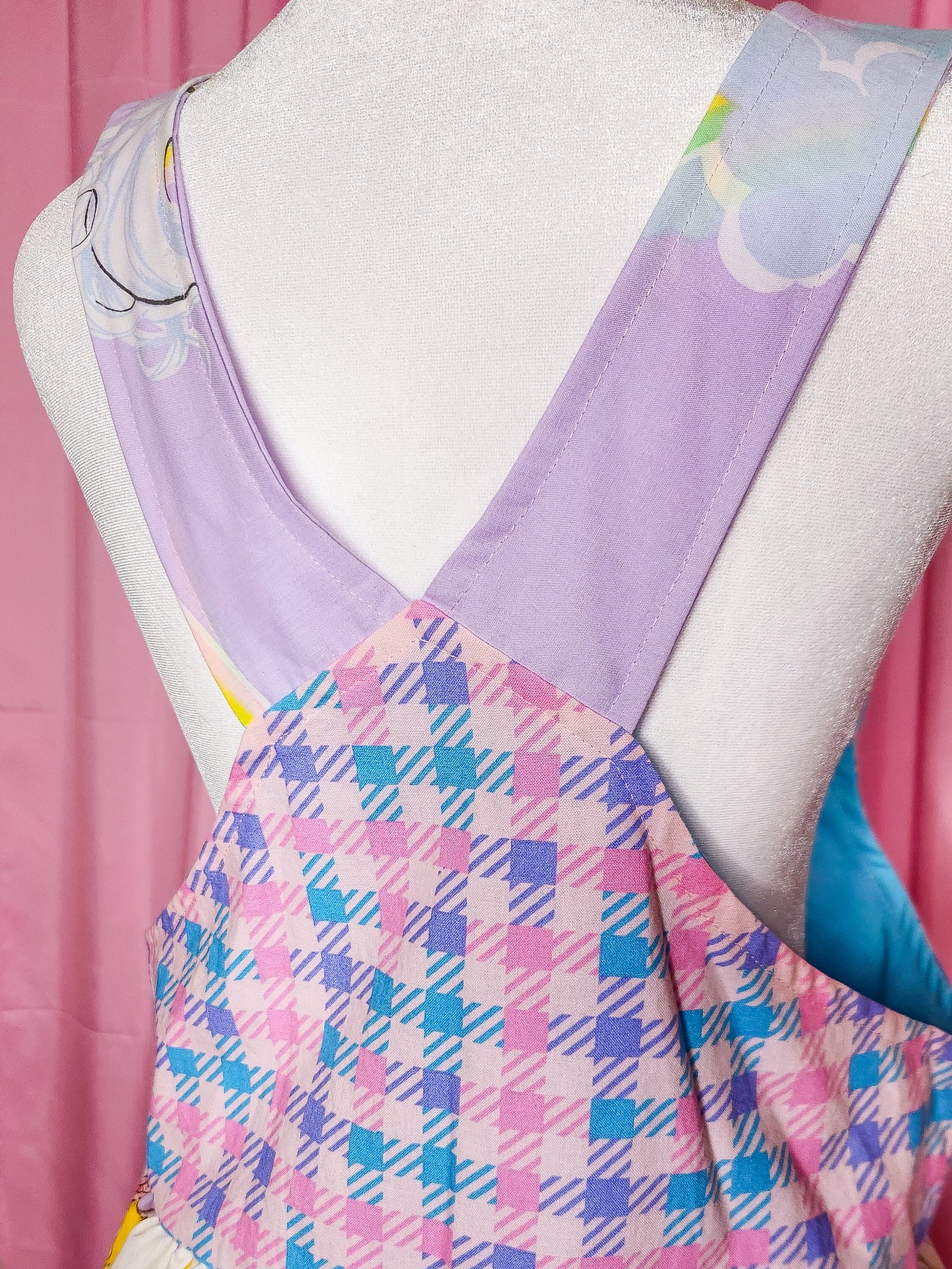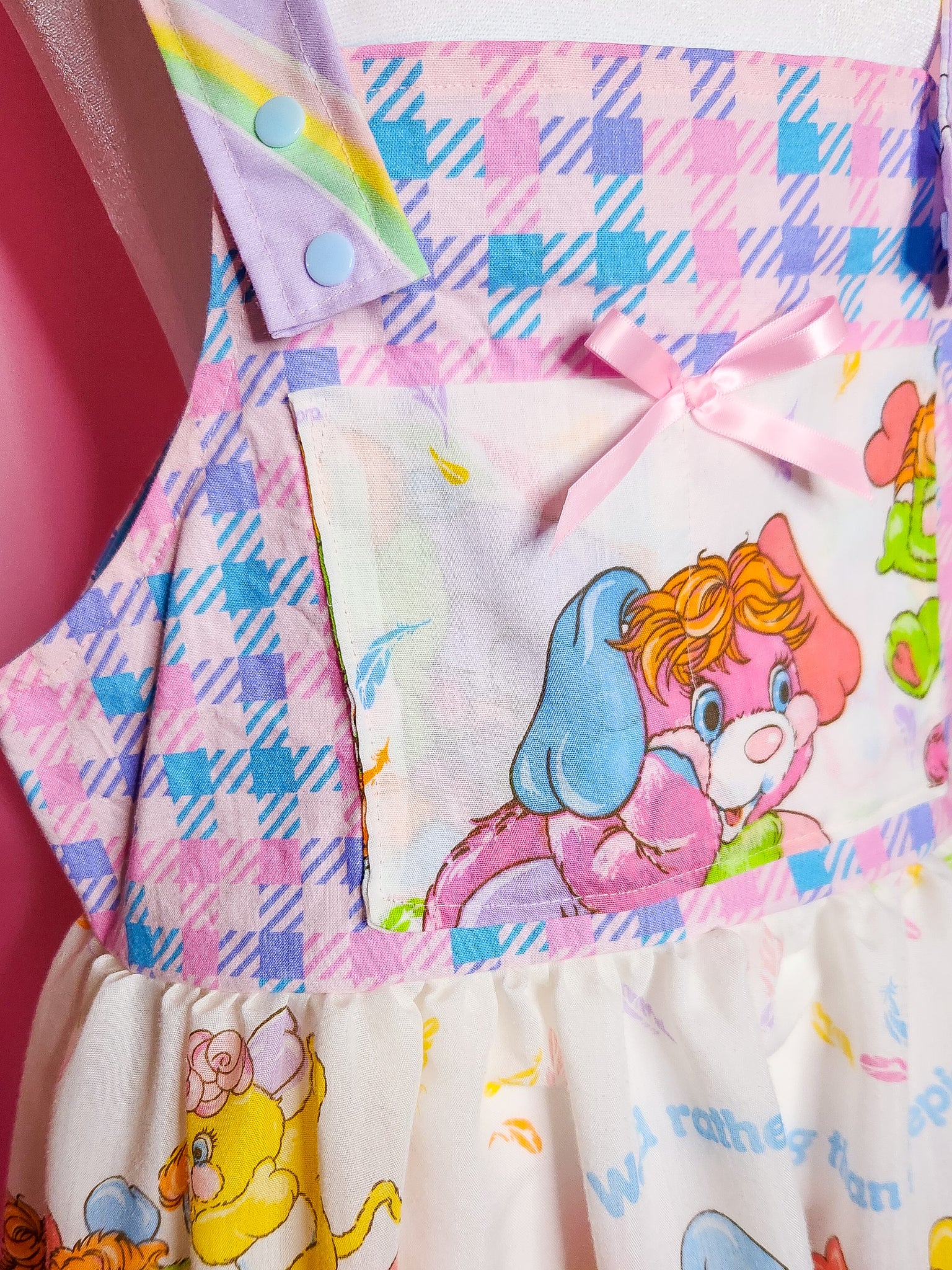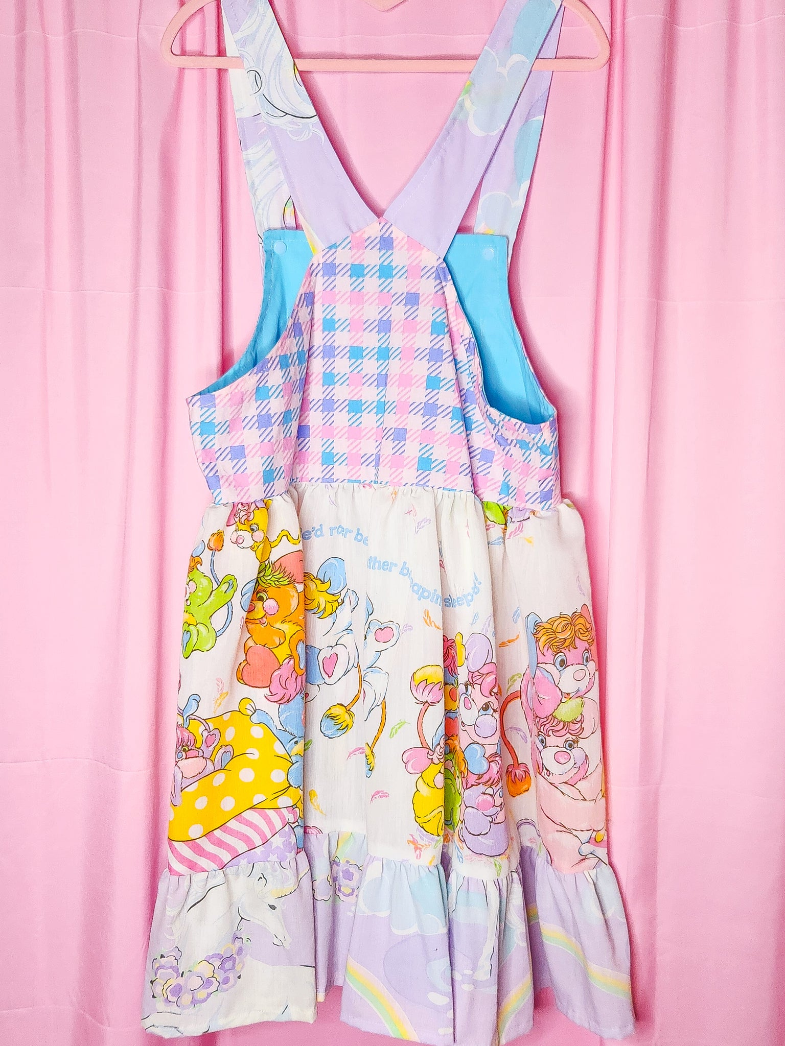 π MATERIALS: THE cutest vintage bedsheets and quilting cotton make up this lolita jumperskirt/salopette! Bib is a super bold pastel houndstooth print with a pocket that matches the main skirt part in upcycled 80's Popples bedsheets! Ruffle is made of pastel lavender unicorn bedsheets with shoulder straps to match. Matching heart applique on front which is edged in pink lace trim. Topped off with pink satin ribbon bows. Light blue plastic snaps on the straps.