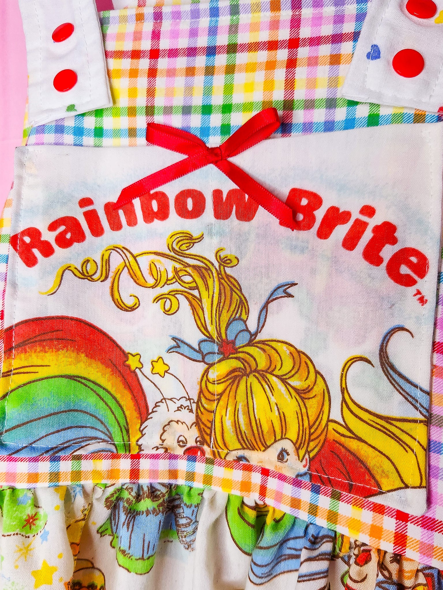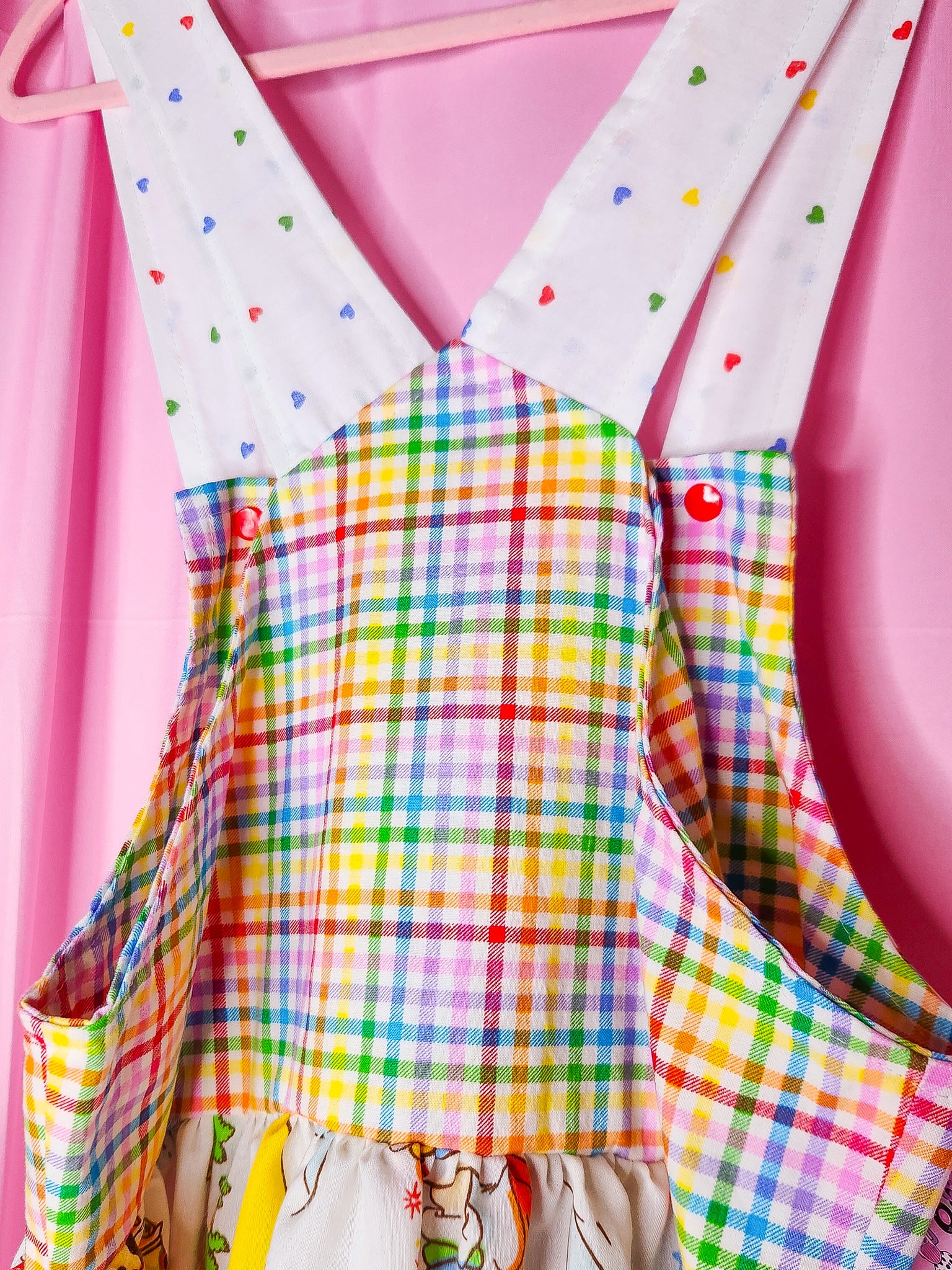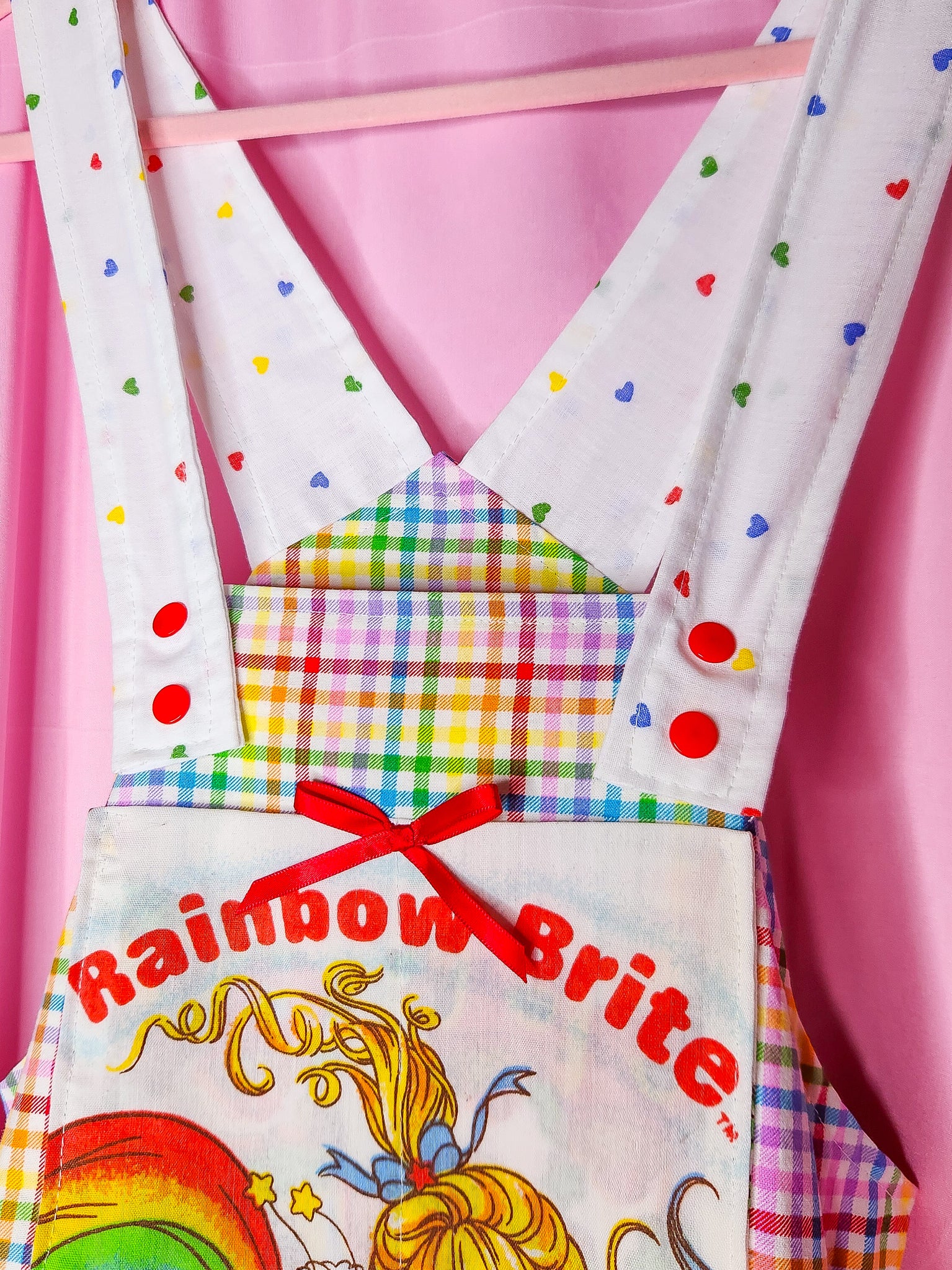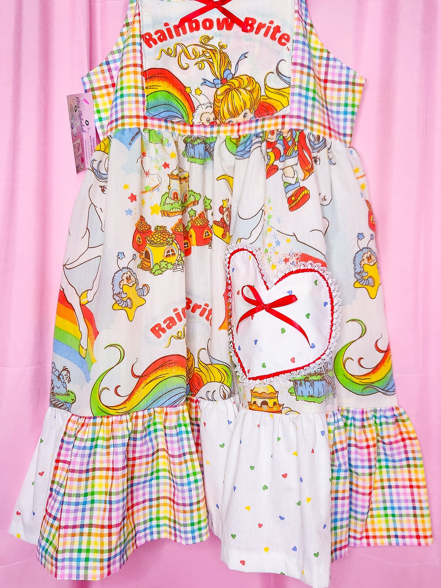 π MATERIALS: THE cutest vintage bedsheets and quilting cotton make up this lolita jumperskirt/salopette! Bib is a super bold rainbow gingham print with a pocket that matches the main skirt part in upcycled 80's Rainbow Brite bedsheets! Ruffle is made of gingham and heart print fabrics patched together. Straps are rainbow heart print with matching heart applique on front which is edged in red/white lace trim. Topped off with redsatin ribbon bows. Red plastic snaps on the straps.