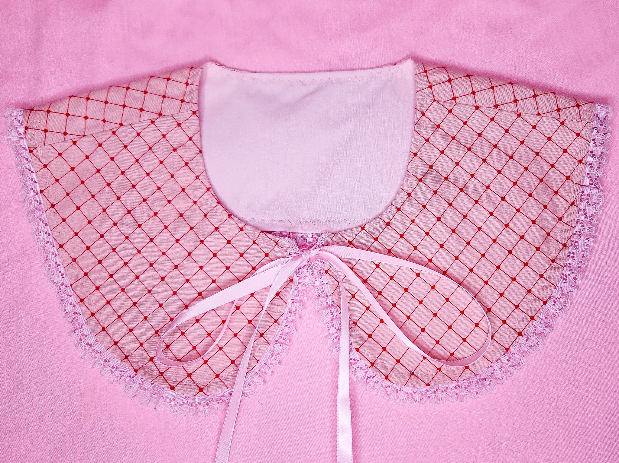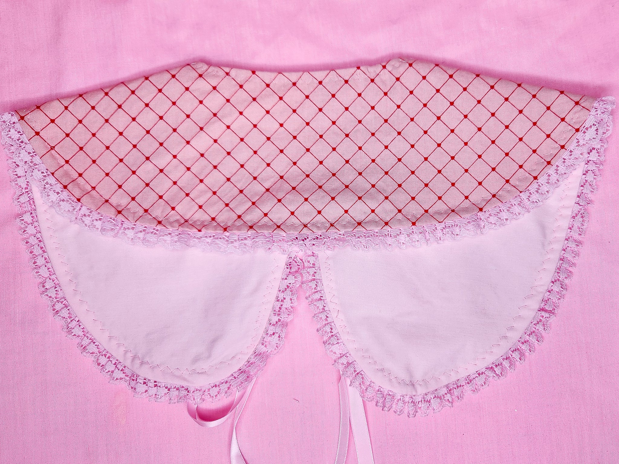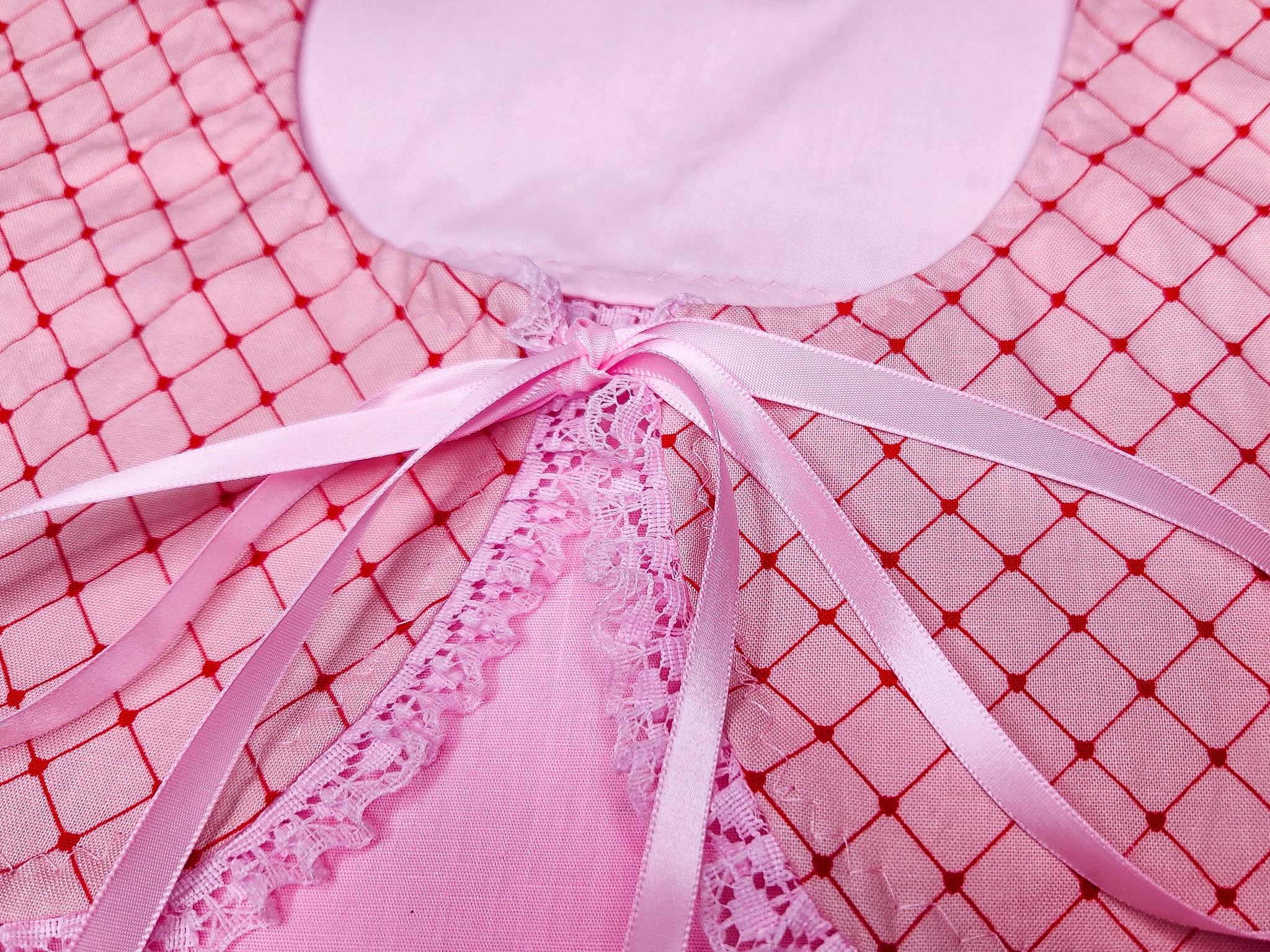 💖 MATERIALS: Pink quilting cotton fabric with a red heart faux quilted/tufted crisscross print! Pink polka dot cotton/poly lining. Pink ruffle lace, ties with pink ribbons!