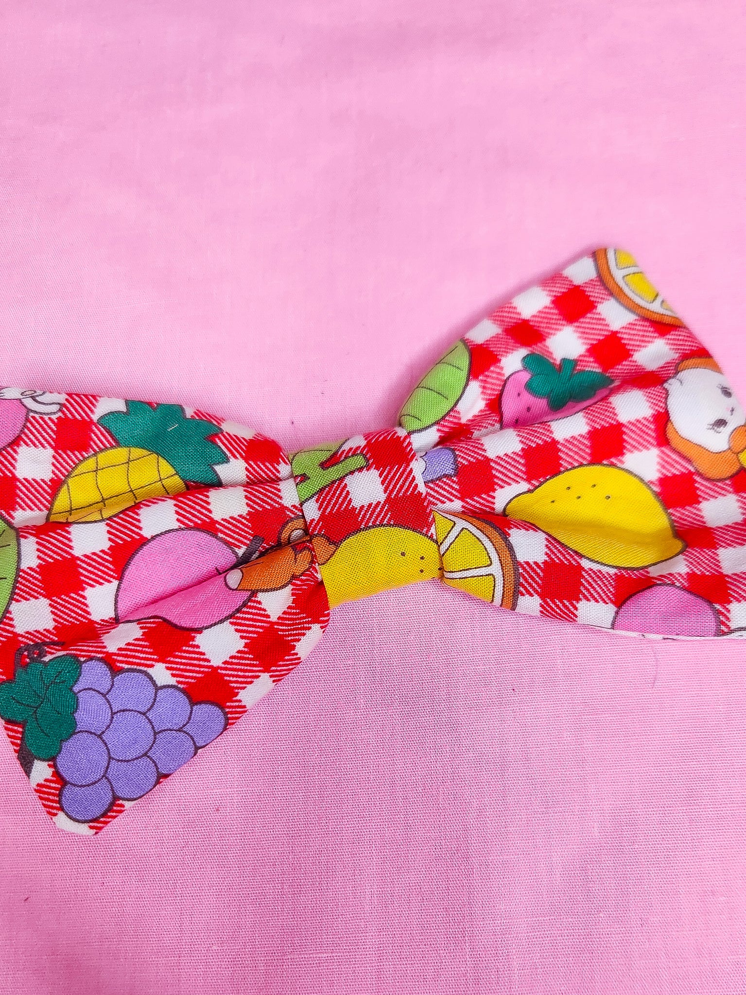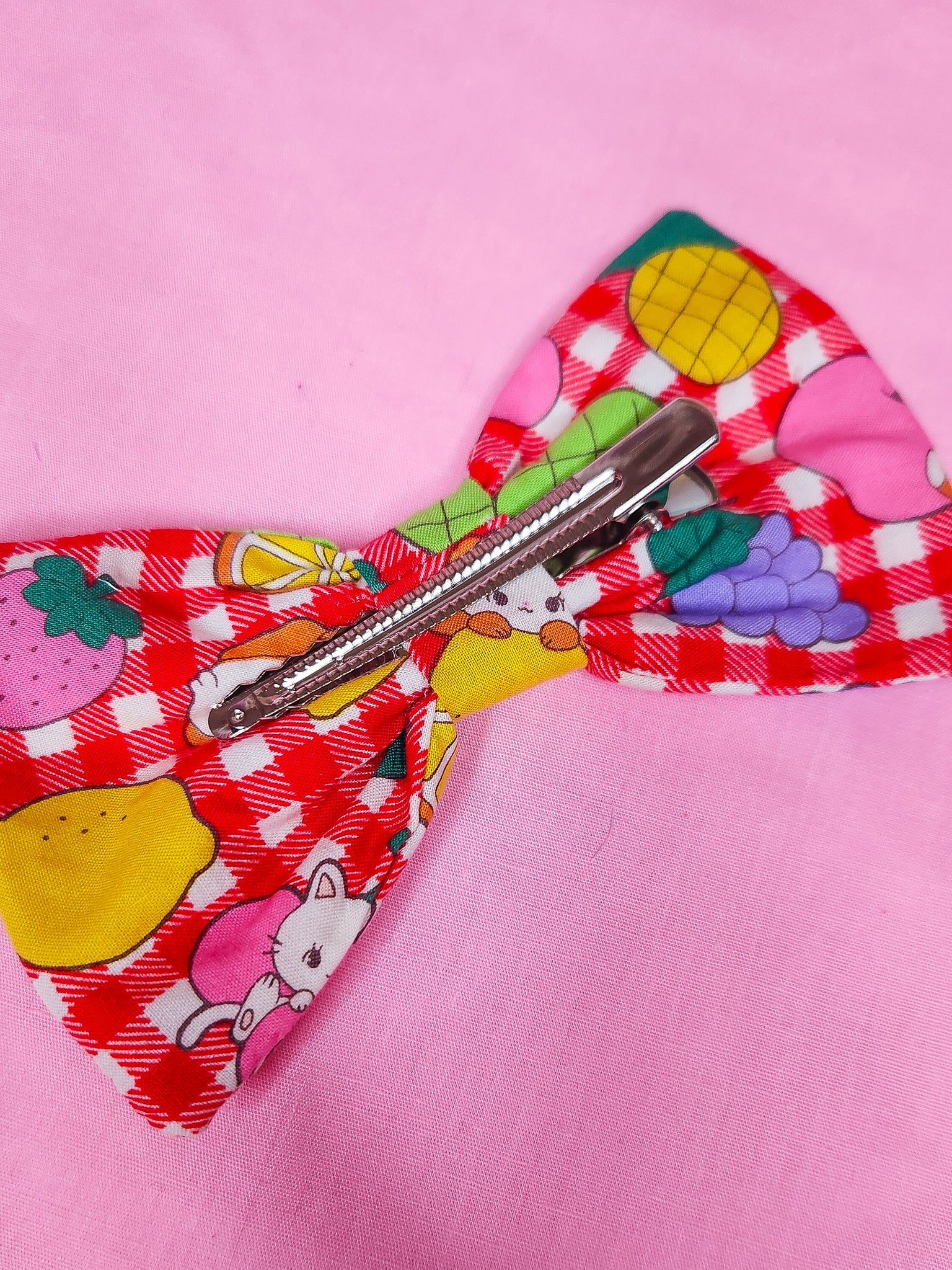πŸ’– MATERIALS: Cotton gingham print in red, with the most 70s/80s fruit and animal pattern! Fastens with alligator clip. Wear in your hair, on your bags, or as a bow tie!