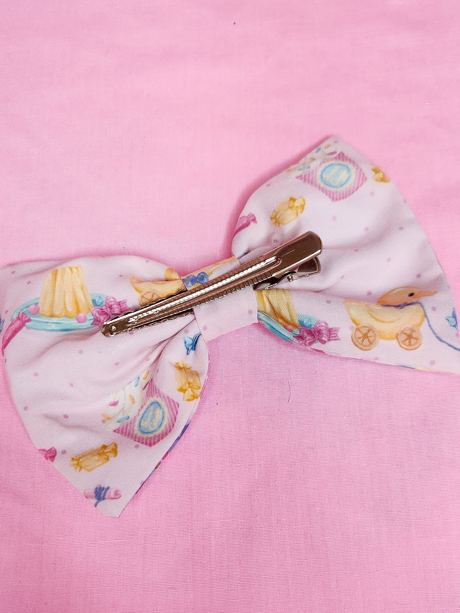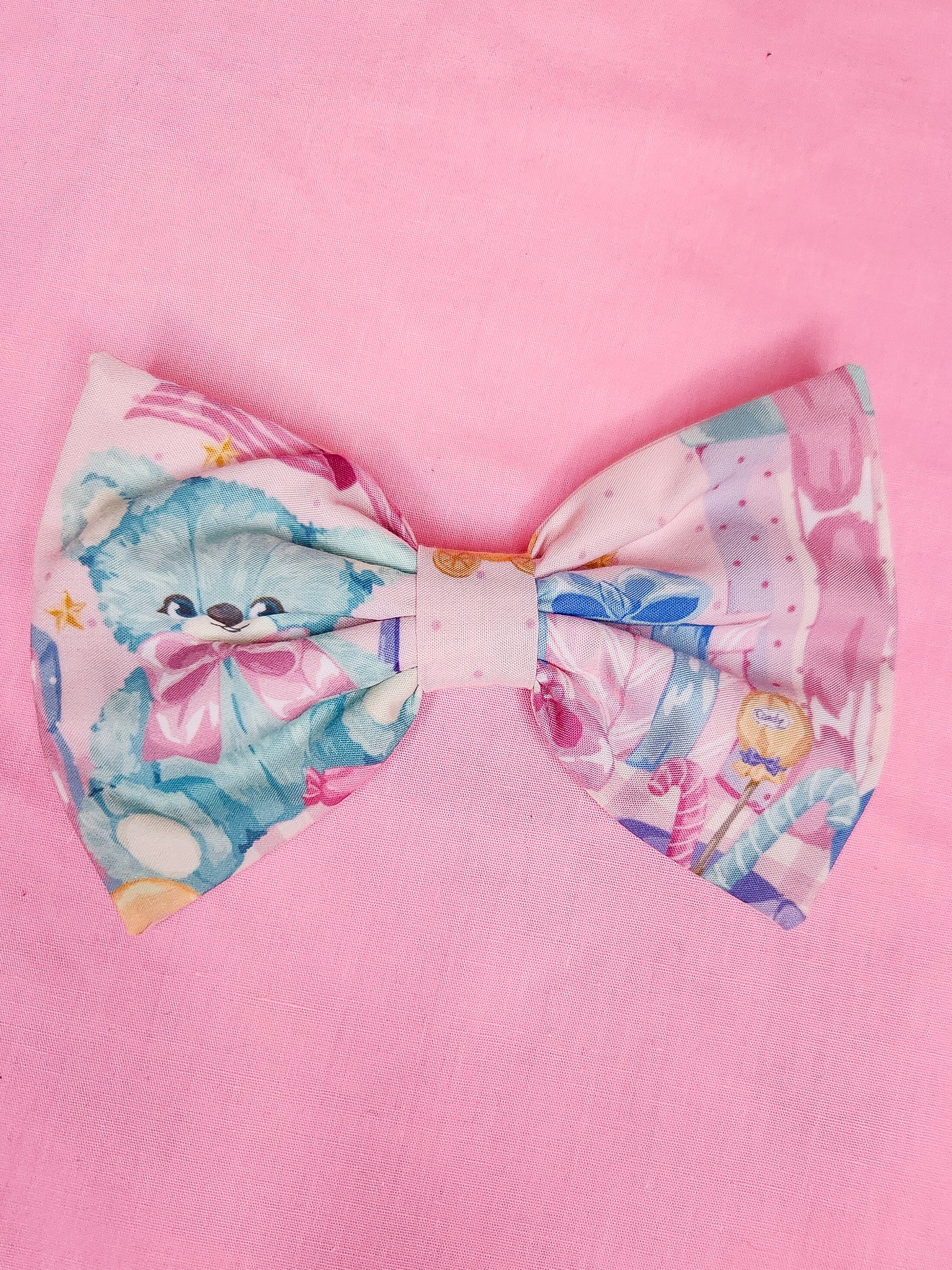 π MATERIALS: Polyester fabric with the sweetest mint green teddy bear and sweets/gift print! Fastens with alligator clip. Wear in your hair, on your bags, or as a bow tie!